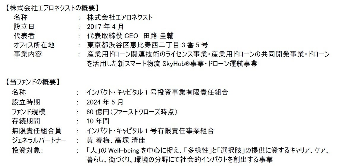インパクト・キャピタル株式会社(東京都渋谷区、代表取締役:黄(尾﨑)春梅、高塚(宮部)清佳)が運営するインパクト投資・キャピタル1 号投資事業有限責任組合(以下、「当ファンド」)は、株式会社エアロネクスト(東京都渋谷区、代表取締役CEO: 田路 圭輔、以下「エアロネクスト」)が実施する第三者割当増資を引き受けました。