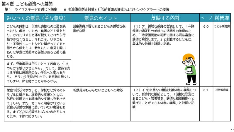 プランの本文を見ていくと、各施策の現状と課題の次に「こども・若者の"こえ"」が列挙されています。