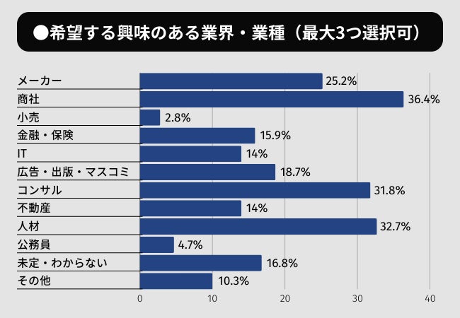 希望する(または興味のある)業界・業種としては、「商社」「コンサル」「人材」「メーカー」の順に希望する人が多い結果となりました。