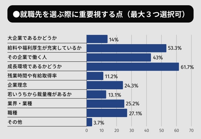 就職活動で企業を選ぶ際に重要視する点として、「成長環境であるか」「給料や福利厚生」を選択する人が共に半数を超えました。次いで、「その企業で働く人」を選ぶ人が多い結果となりました。