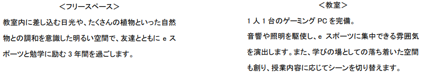 校舎には高性能なゲーミングPCや周辺デバイスを完備し、通信回線はNTT東日本が提供する高速回線「フレッツ光クロス」を使用することで、生徒・先生がeスポーツやデジタルスキル学習に専念できる学びの空間を提供します。