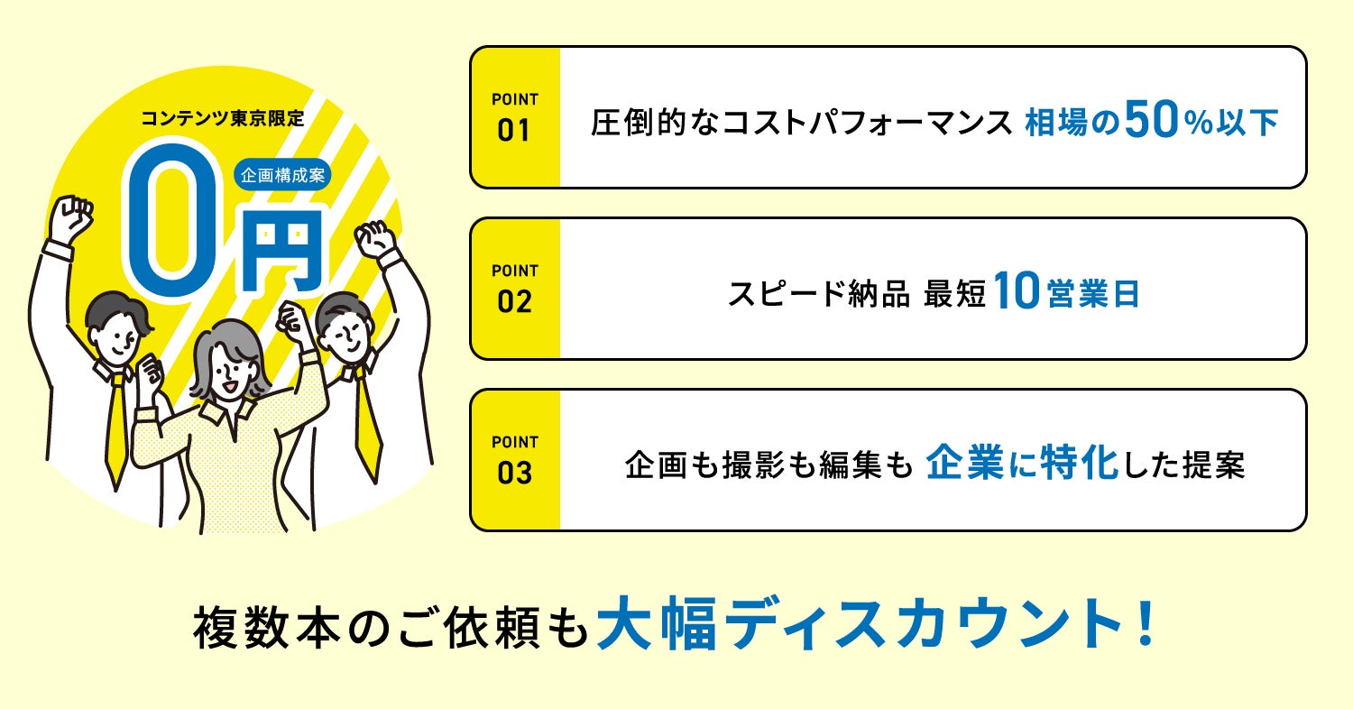 初めて動画制作をする企業の方でも安心してご依頼いただけるように、相場よりも低価格・短納期・高品質な映像作品をご提供します。
