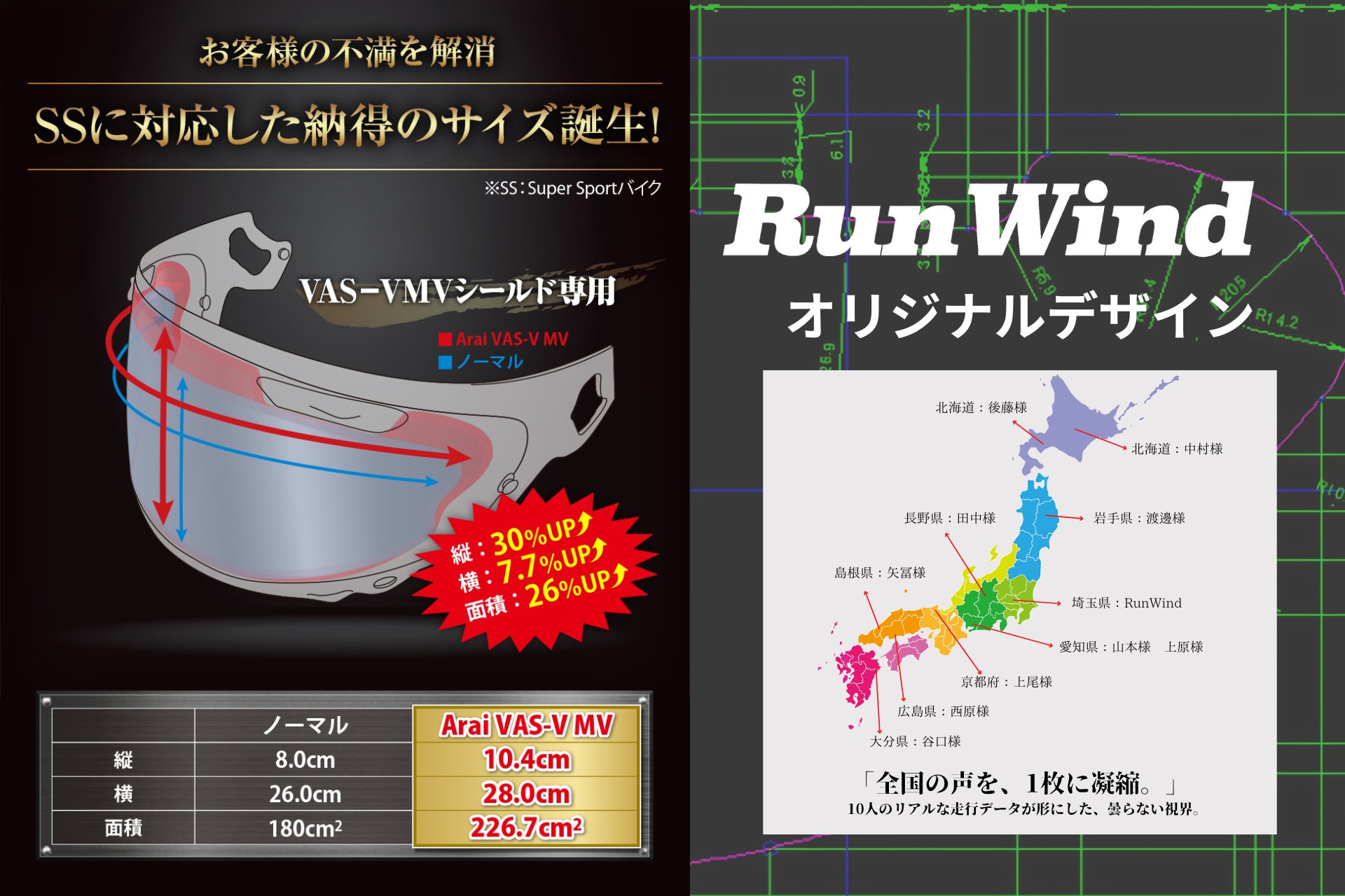 これまで多くのユーザーから寄せられた「もっと広い視界で使いたい」「Arai専用が欲しい」という声に応え、ワイドサイズとは異なる専用設計での新製品を実現しました。