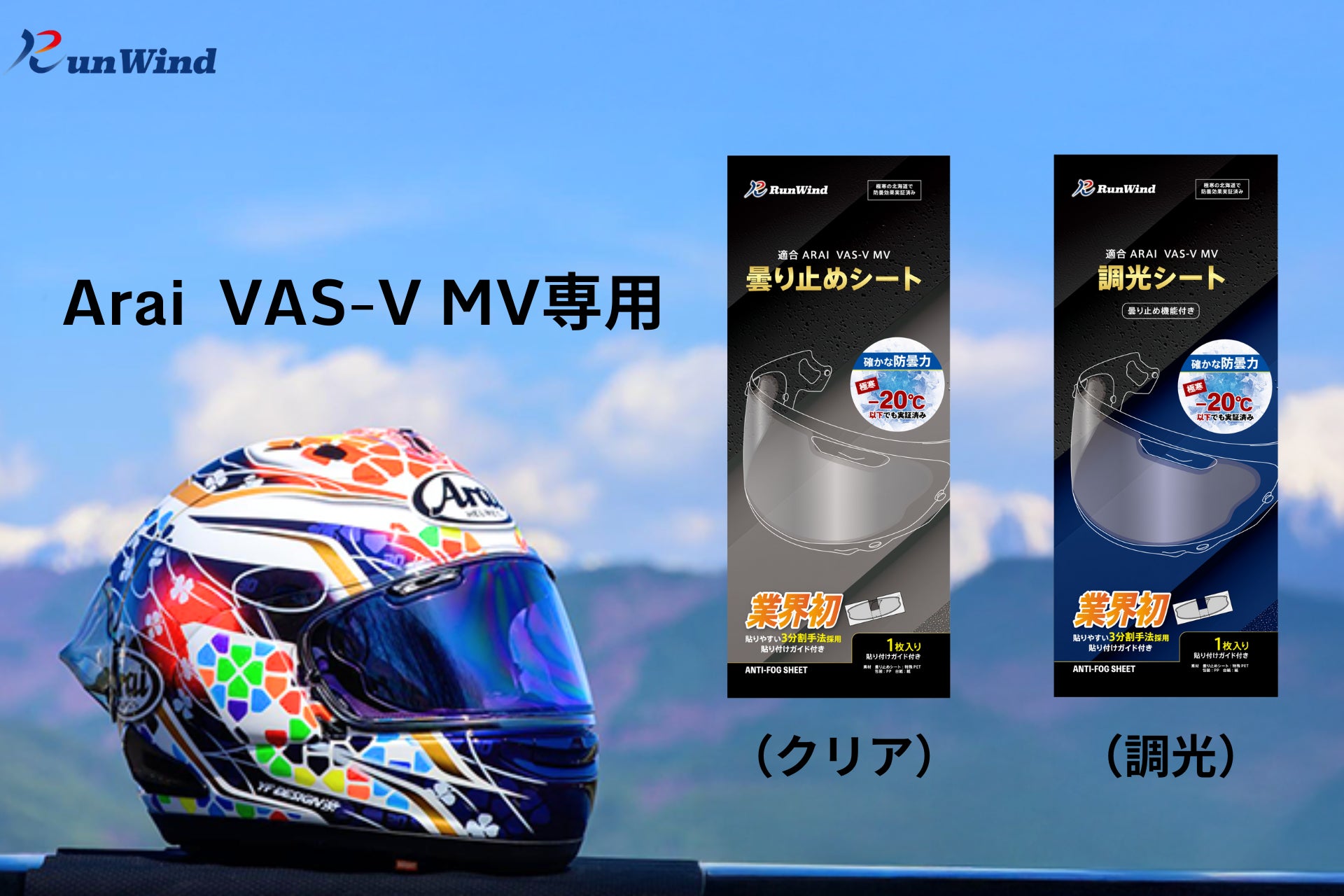 「RunWind」より、Arai VAS-V MVシールド専用設計の曇り止め・調光シートが新登場。寒冷地・北海道陸別町でのマイナス20℃以下の環境で実証試験を行い、極寒・雨天・夜間など、あらゆる走行シーンでライダーの視界をしっかり守ります。