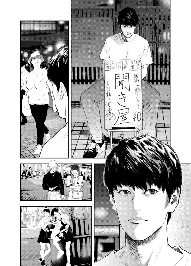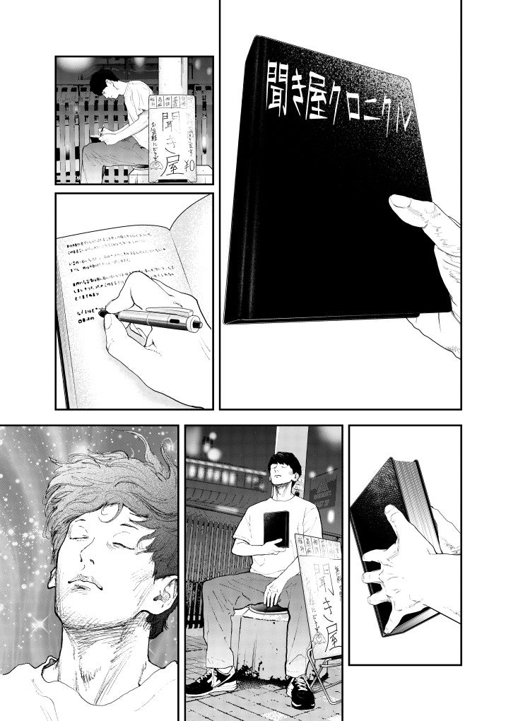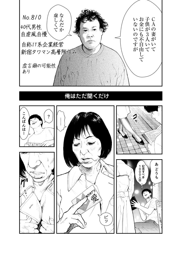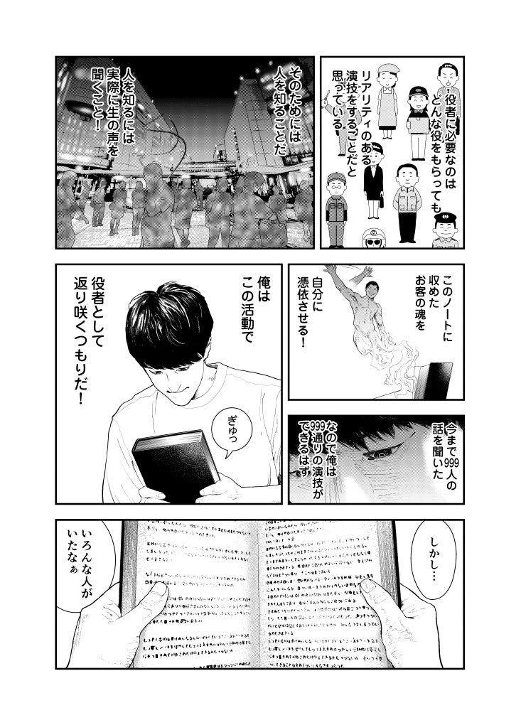 街を行き交う人々の悩みや愚痴など、どんな話にも耳を傾け、時には暇つぶしの相手にも付き合う。見知らぬ人たちの人生をのぞき見て、役者としての幅を広げ、演技派として再起を図るためだった。