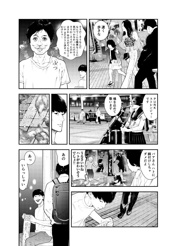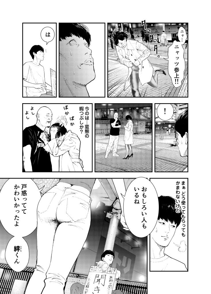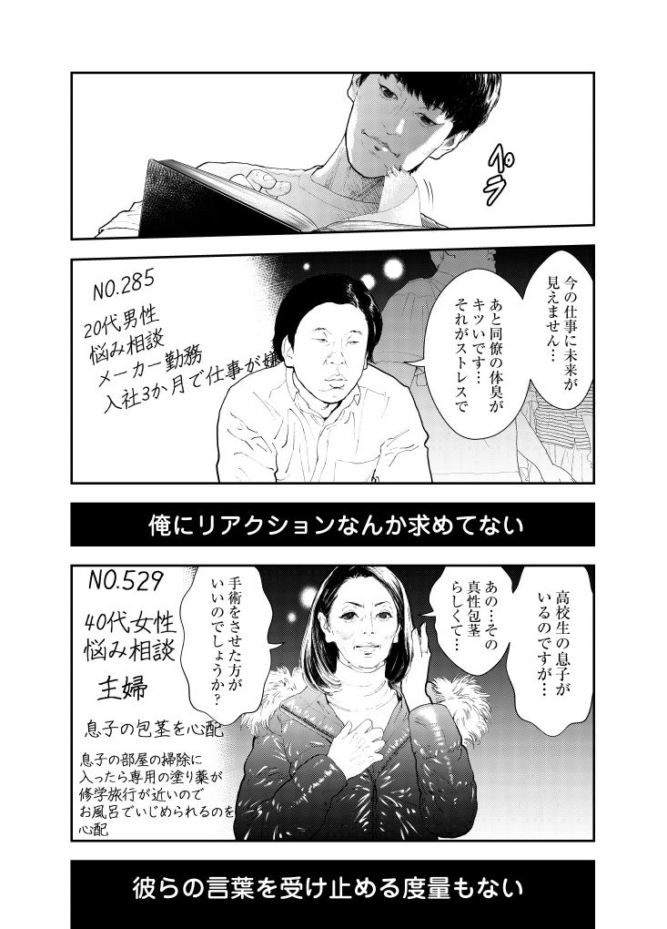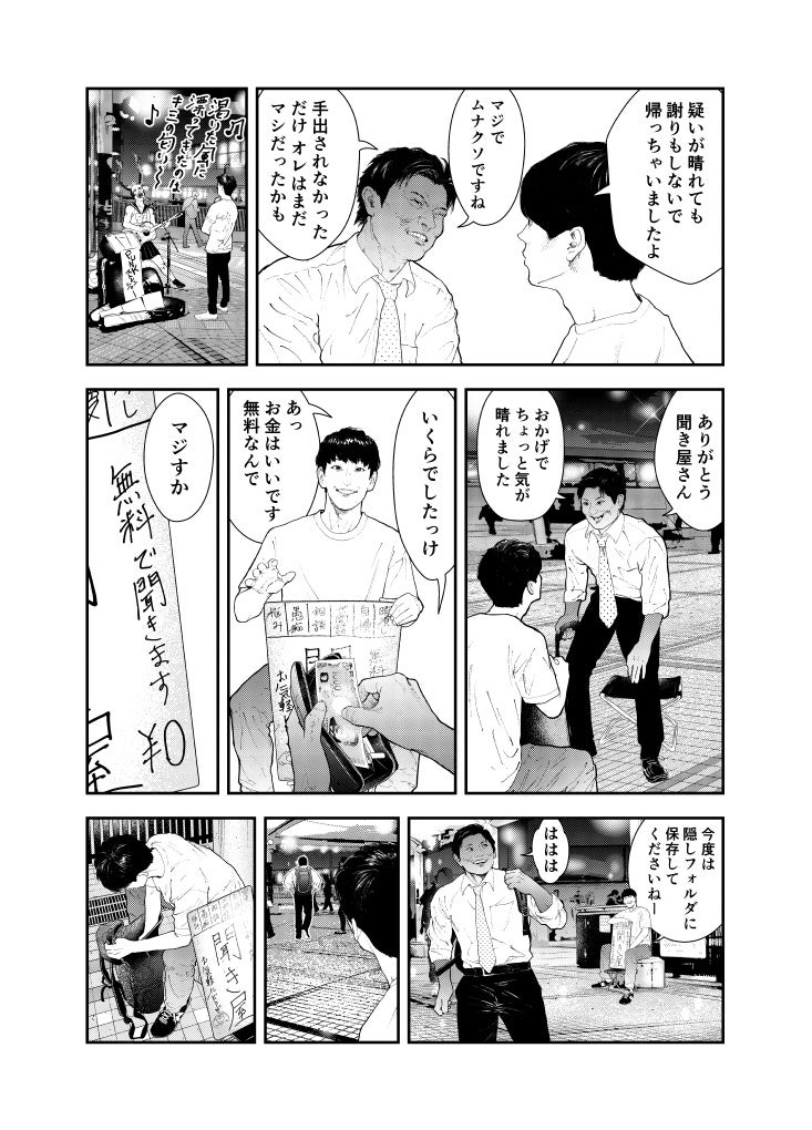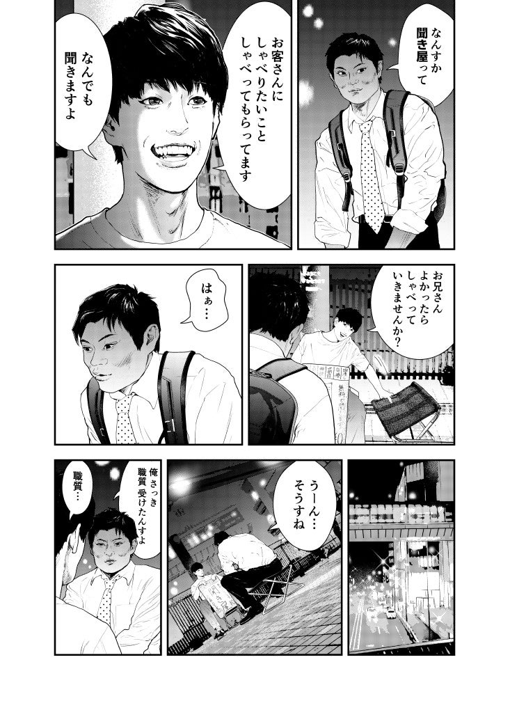 街を行き交う人々の悩みや愚痴など、どんな話にも耳を傾け、時には暇つぶしの相手にも付き合う。見知らぬ人たちの人生をのぞき見て、役者としての幅を広げ、演技派として再起を図るためだった。
