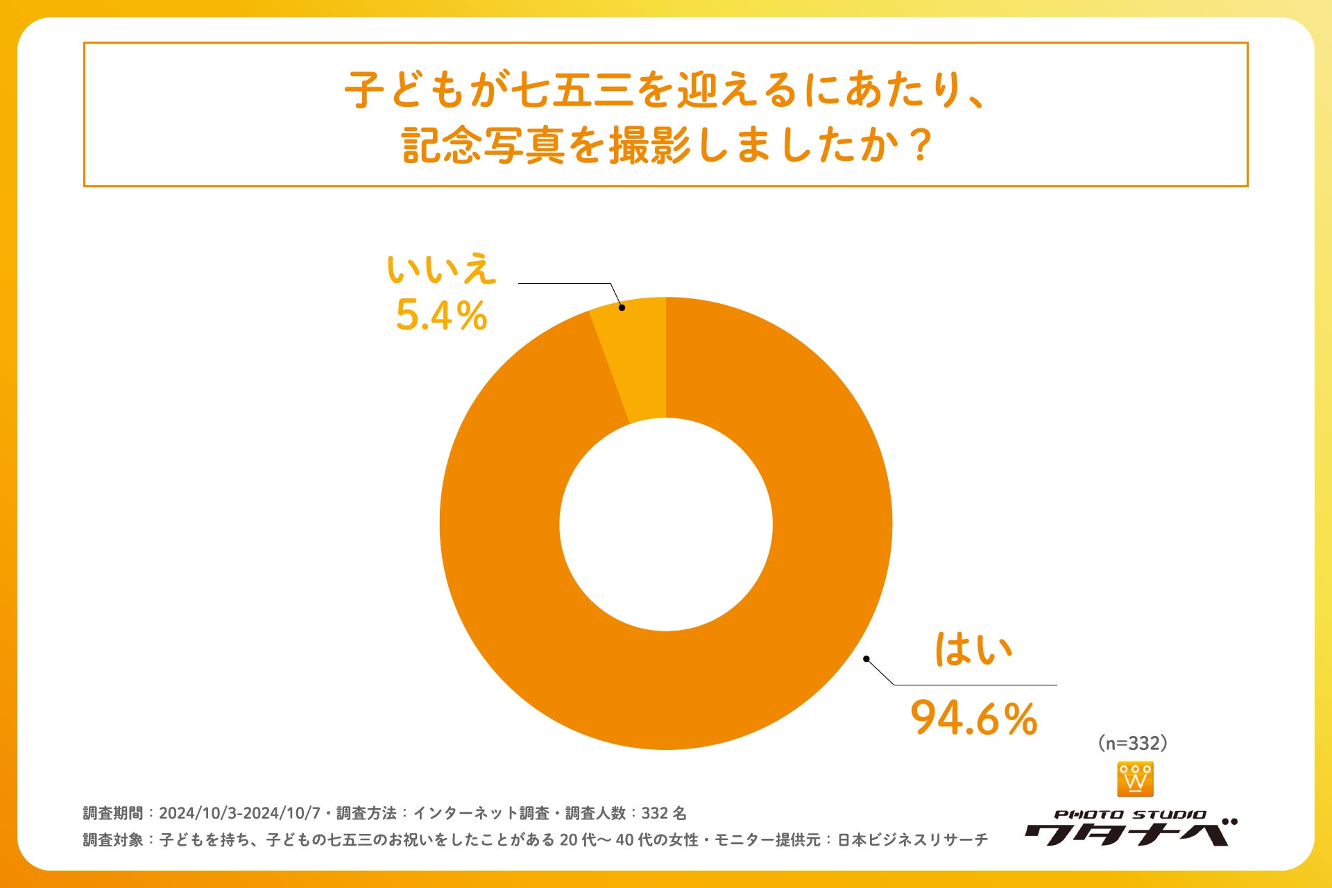 まず、「子どもが七五三を迎えるにあたり、記念写真を撮影したか」を尋ねる設問への回答では「はい」が94.6%となりました。この結果から、ほとんどの家庭で七五三のお祝いで記念写真を撮影していることがわかりました。