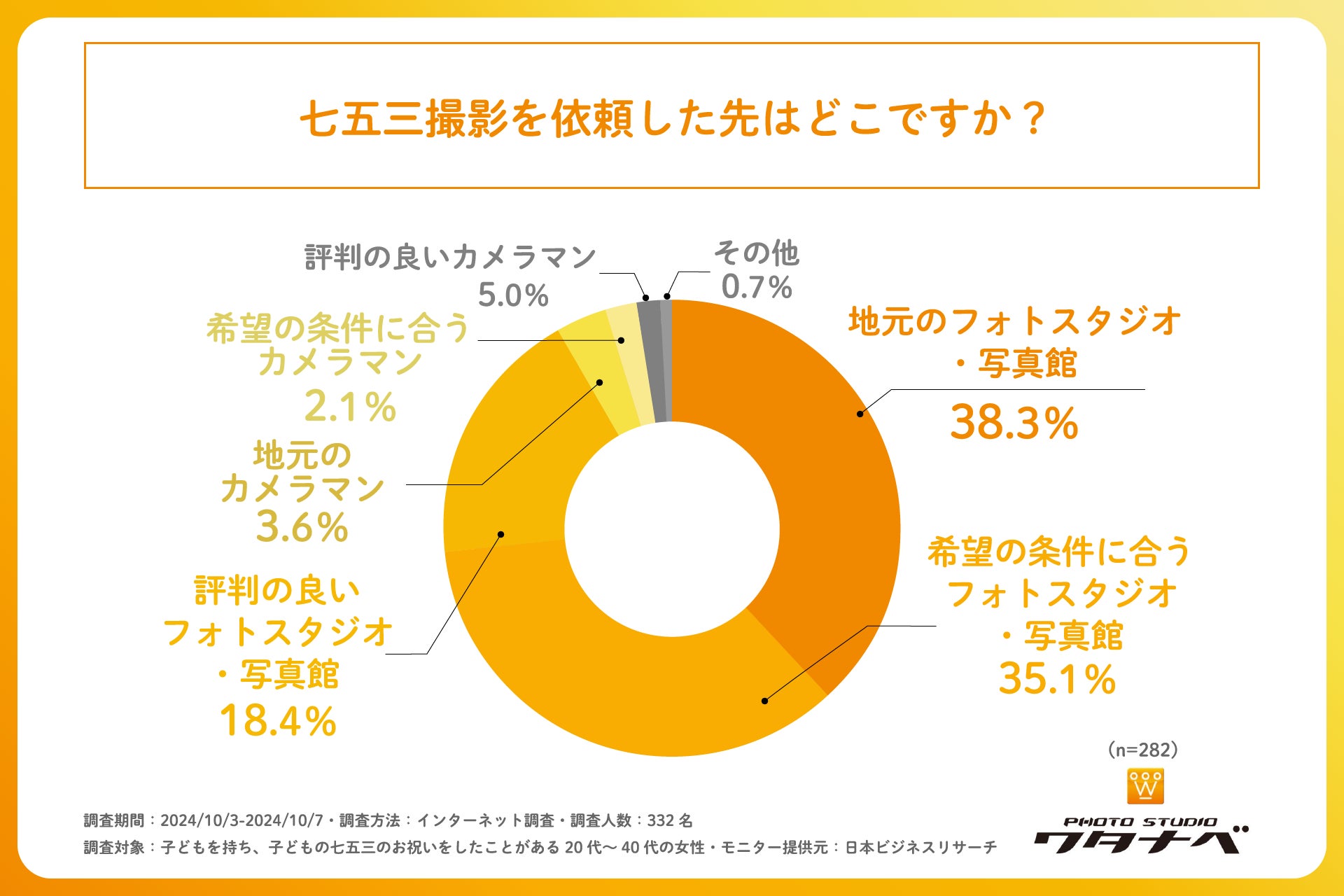 また、「子どもの七五三撮影を専門業者に依頼した」と回答された方に「七五三撮影を依頼した先はどこか」を尋ねる設問の回答では、1位が「地元のフォトスタジオ・写真館」で38.3%、2位が「希望の条件に合うフォトスタジオ・写真館」で35.1%、3位が「評判の良いフォトスタジオ・写真館」で18.4%となりました。1位~3位までの回答率を合計すると90%を超える結果となり、七五三撮影は大半の家庭がフォトスタジオや写真館に依頼をしていることが判明しました。