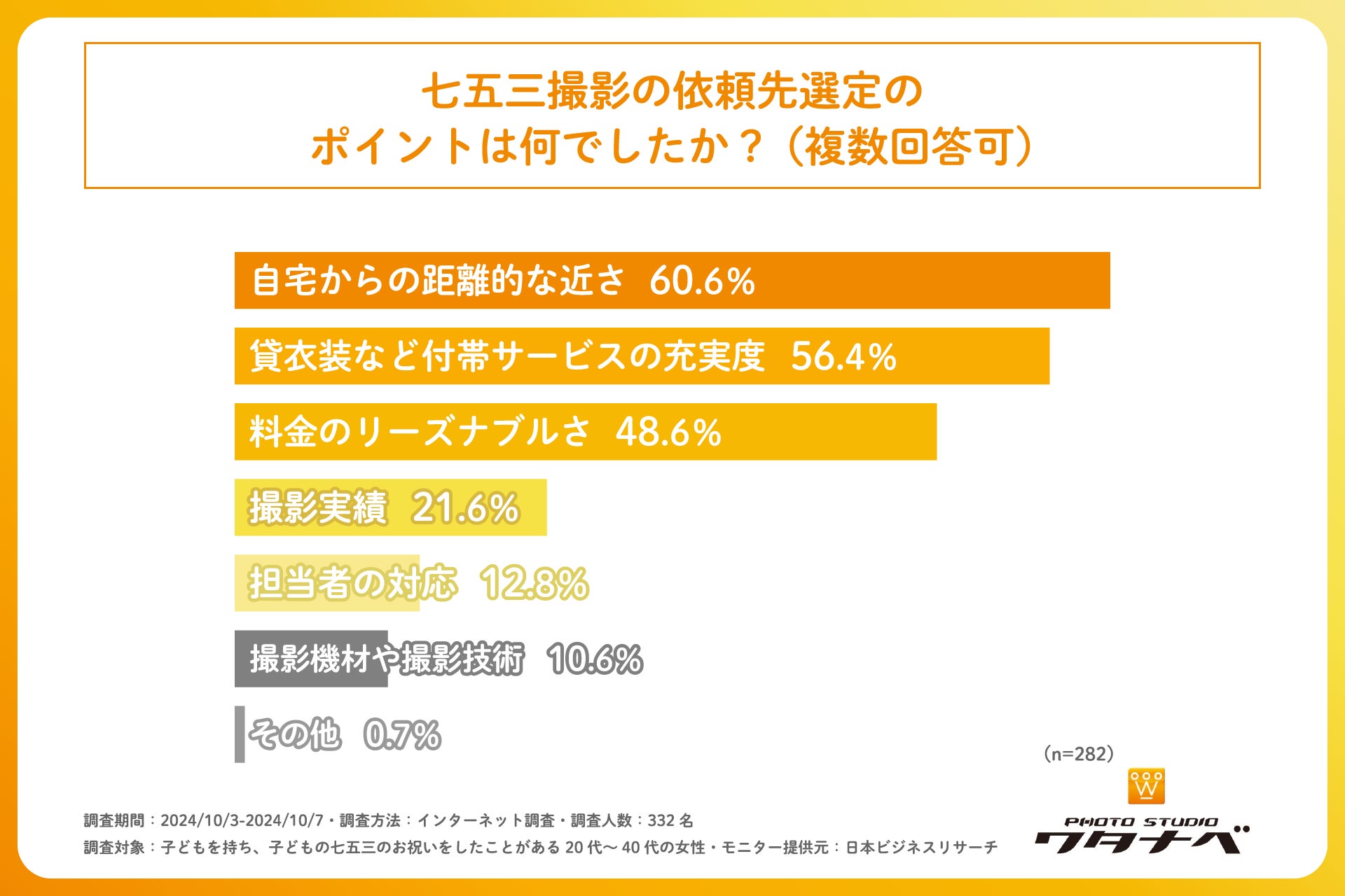 続いて「子どもの七五三撮影を専門業者に依頼した」と回答された方に「七五三撮影の依頼先選定のポイント」を問う設問の回答では、1位が「自宅からの距離的な近さ」で60.6%、2位が「貸衣裳など付帯サービスの充実度」で56.4%、3位が「リーズナブルな料金」で48.6%という結果になりました。この上位3つの回答の回答率が高く、七五三撮影の依頼先選定の主なポイントは「自宅からの近さ」「付帯サービスの充実度」「料金のリーズナブルさ」の3点であることがわかりました。