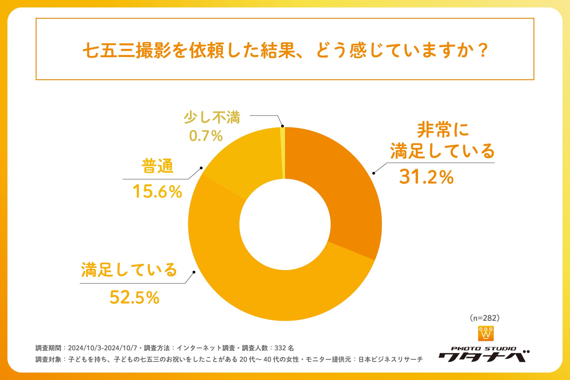 また、調査の最後「子どもの七五三撮影を専門業者に依頼した」と回答された方に「七五三撮影を依頼した結果、どう感じているか」を尋ねる設問への回答では1位が「満足している」で52.5%、2位が「非常に満足している」で31.2%となりました。1位と2位の回答率を合計すると80%を超え、子どもの七五三撮影を専門業者に依頼した方の多くがその結果に満足していることが明らかになりました。