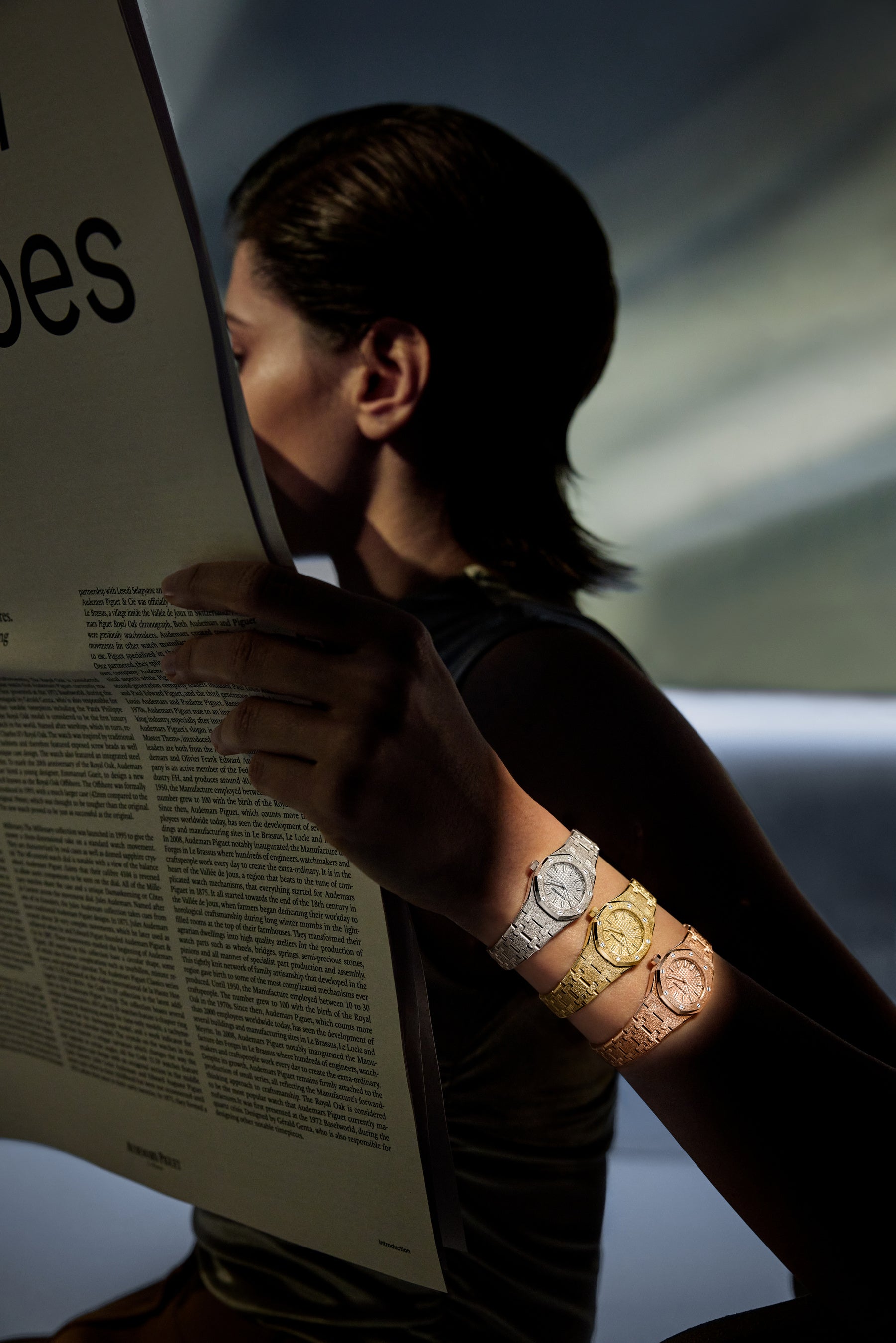 繊細な仕上げはもちろんダイヤルにも採用されています。トーンオントーンのプチタペストリーモチーフは、ケースとブレスレットのフロステッドゴールドのきらめきをさらに引き立てます。日付表示のないシンプルなダイヤル上のファセット付のゴールド アワーマーカーはケースのカラーとマッチし、暗いところでも時刻を読みやすい蓄光処理が施されています。ジュエリーのようなブレスレットも、オーデマ ピゲが誇る高品質の仕上げ技術によりどんな手首にも自然にフィットします。ムーブメントはクォーツムーブメント、キャリバー2730を搭載。電池寿命7年以上の高精度クォーツが、忙しい現代のライフスタイルに寄り添います。