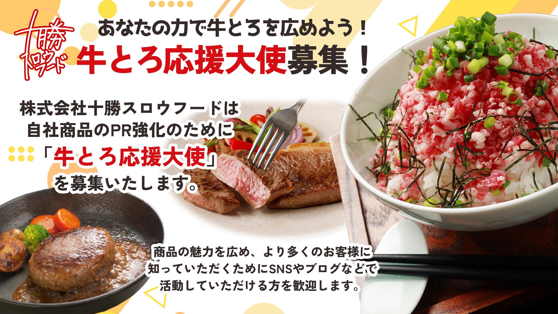 株式会社十勝スロウフードは、自社商品のPRを強化するために「牛とろ応援大使」を募集します。商品の魅力を広め、より多くのお客様に知っていただくために、SNSやブログなどで発信活動をしていただける方を歓迎します。