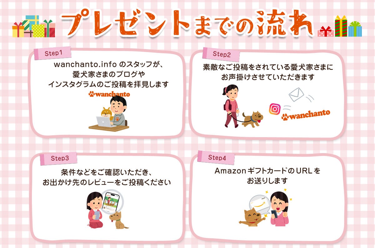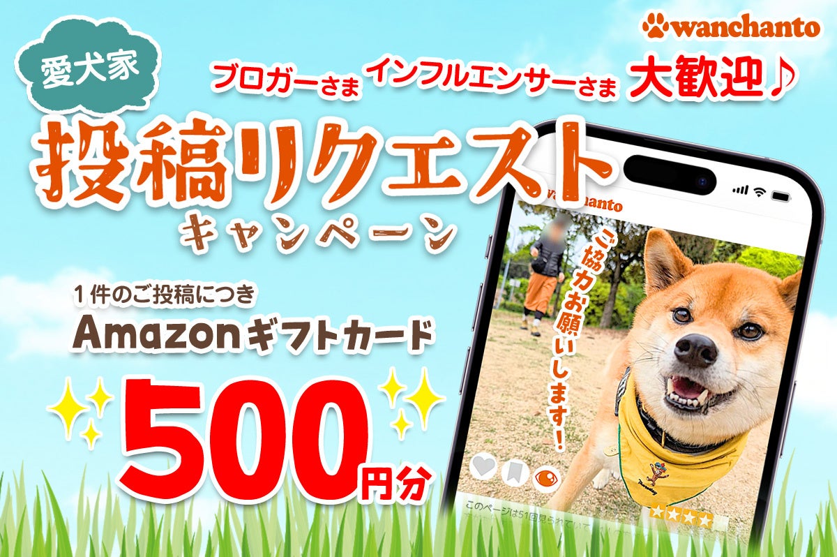 対象の投稿を「ワンちゃんと(wanchanto.info)」にご投稿いただくと、1件につきAmazonギフトカード500円分をプレゼントいたします。すでに他のプラットフォームに掲載済みのレビューでもご投稿可能ですので、この機会にぜひご参加ください。