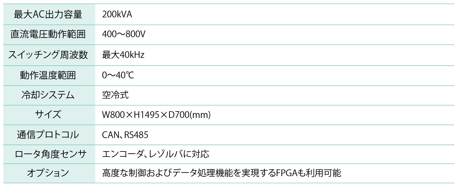 ヘッドスプリングの新製品「200kVA大容量SiCインバータ」は、次世代モータおよびモータ駆動システムの開発・評価のためのインバータ装置であり、以下の特長を備えています。