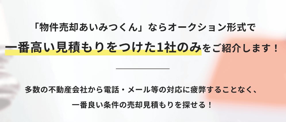 「物件売却あいみつくん」は、売りたい不動産をオークション形式の一括査定に出し、最も高値をつけた1社をご紹介するサービスです。一般的な一括査定サービスを利用すると複数の会社から電話やメールなどが来て、それぞれに対応しなければなりません。