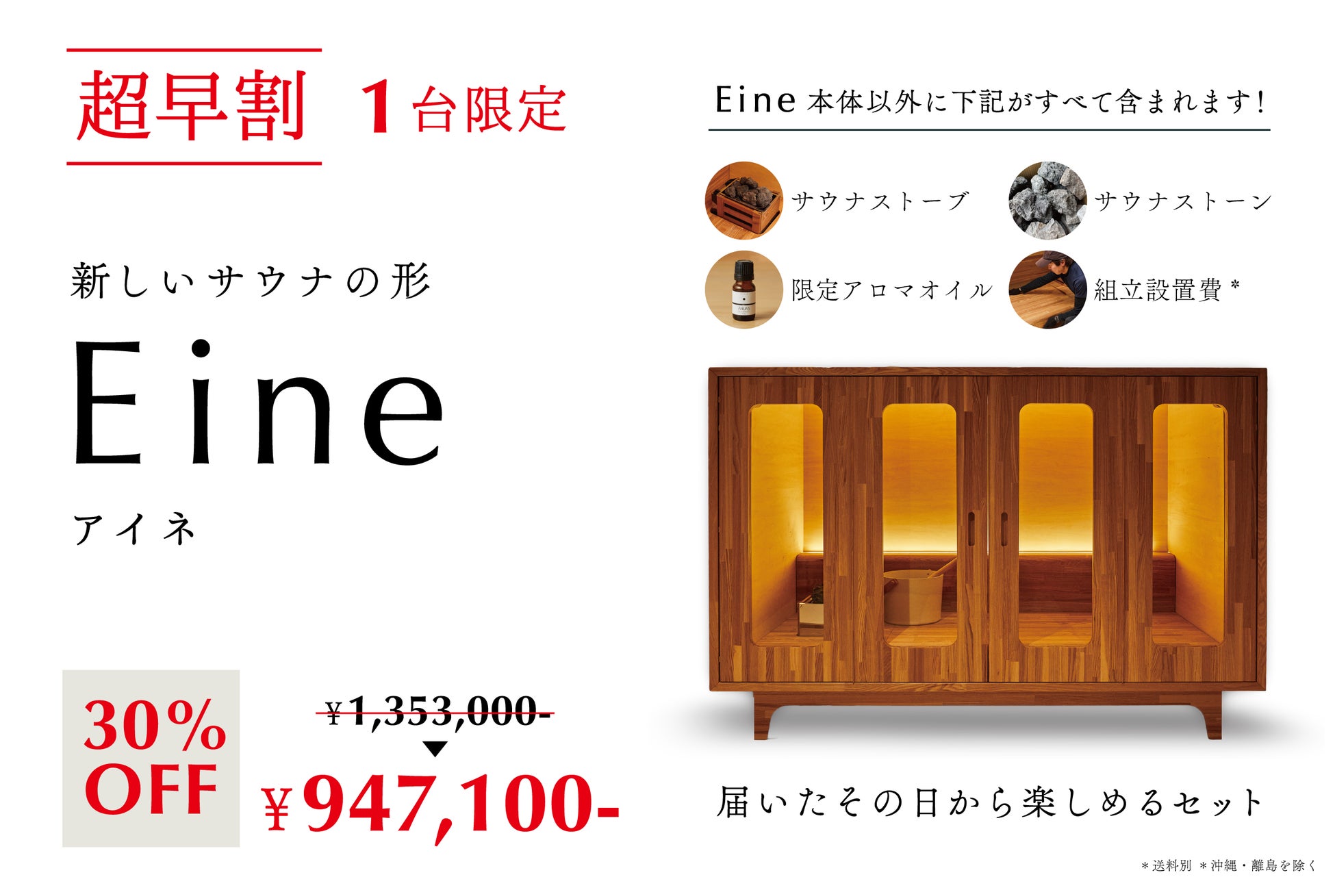 「Eine」は、日本の住宅事情と現代のライフスタイルに配慮した家具型のミニサウナです。限られた住空間でも設置しやすいデザインを採用し、リビングにも自然に溶け込むよう設計されています。リモートワークや家族との時間が増える中で、自分自身と向き合う「引きこもれる空間」を提供するために開発されました。製品名「Eine」はドイツ語で“一つの”を意味し、忙しい日々の中で特別なひとときを生み出します。