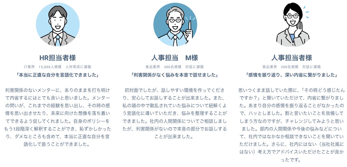 安心して相談できる環境:社外メンターだからこそ、安心して本音を相談でき、管理職自身が対話の効果を実感しながら、精神的な負担を軽減することを目指します。