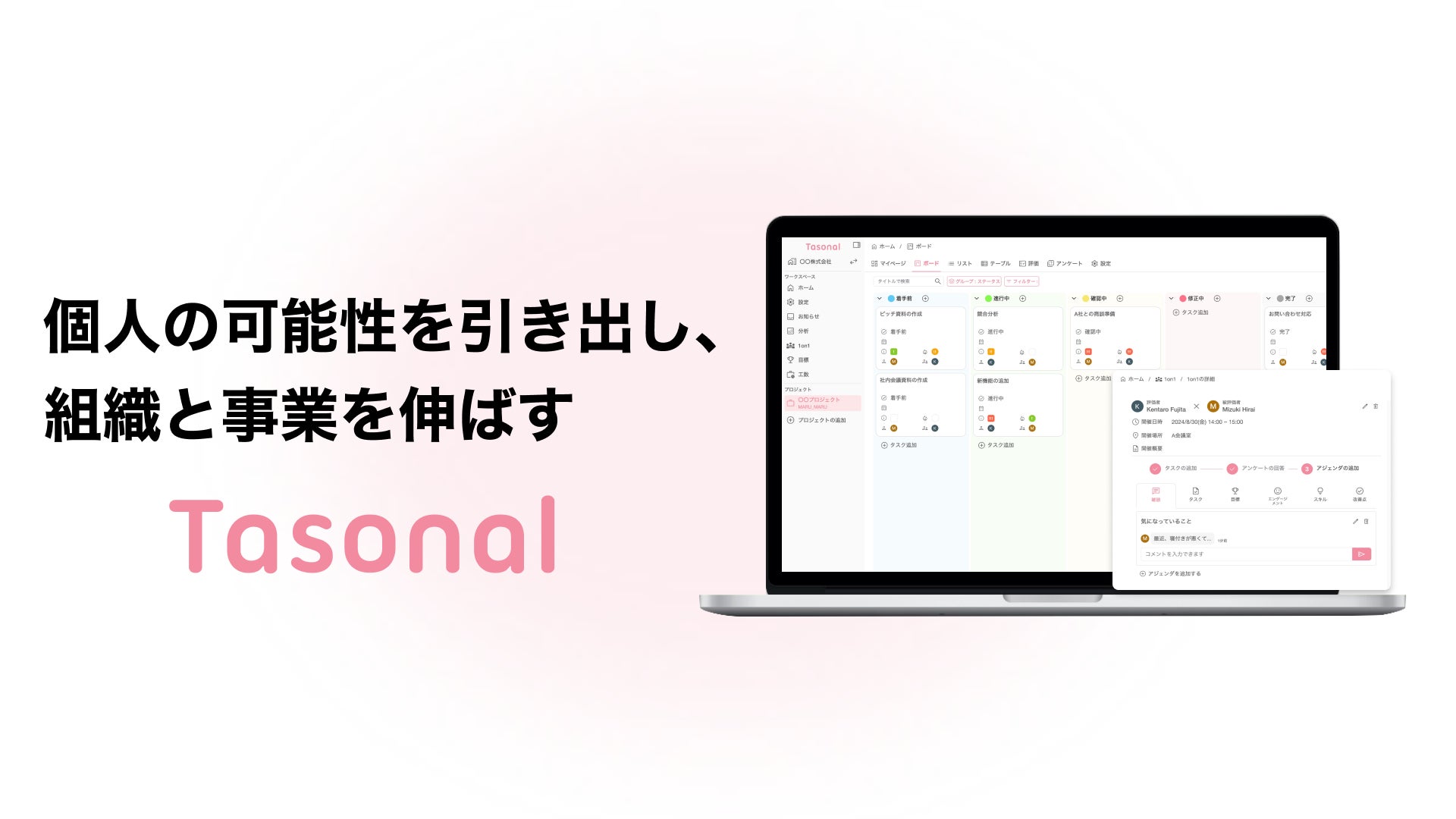 「Tasonal」は、個人のキャリア形成と組織の成長を支援するためのデータ活用プラットフォームです。タスク管理機能や1on1管理機能、目標管理機能から人材データ(スキル・エンゲージメント・志向性など)を収集/可視化し、それらのデータを元にした人材管理や業務の改善を支援します。