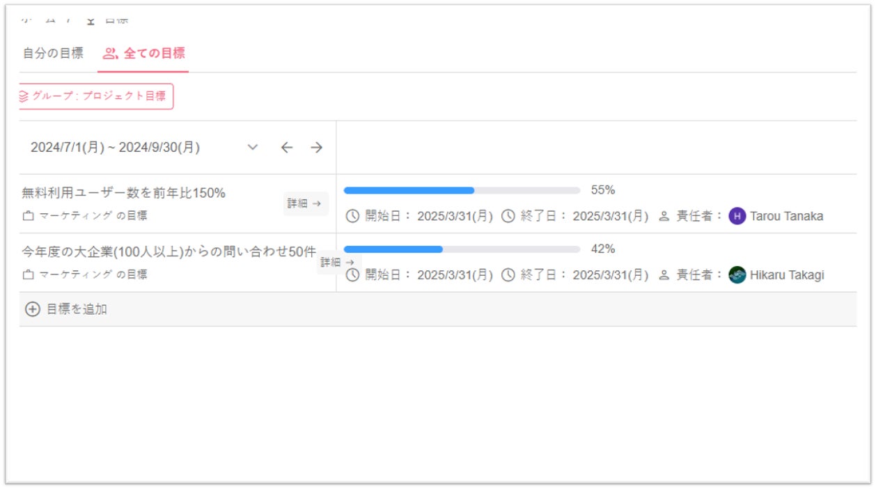ワークスペース、プロジェクト、個人の単位で目標を設定し、目標の進捗を組織のメンバーに共有できます。メンバーは目標に沿って自分のタスクを遂行すればよいため、メンバー間の認識のずれを防止します。