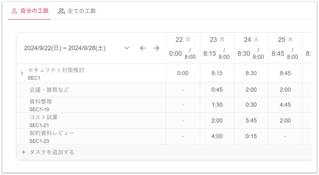 タスク管理機能と連携して、タスクごとに可視化された、より高度な工数管理を可能にします。