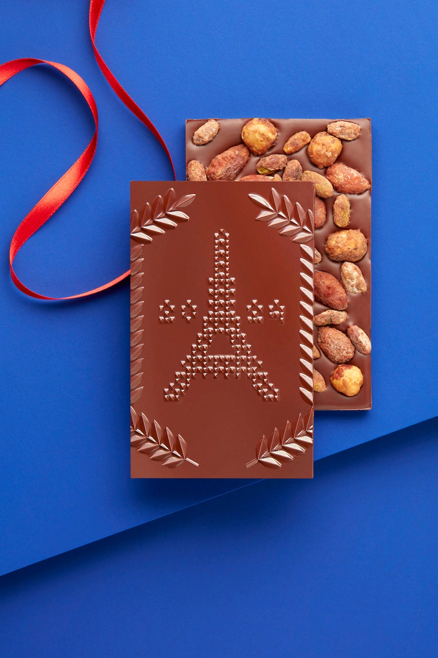 「タブレット トリオンフ」はフランス語で“勝利”と名付けられたタブレットで、厳選したイタリア産のアーモンド、ヘーゼルナッツ、ピスタチオを散りばめたマンディアンタイプのショコラです。片面にナッツ、反対側にはパリらしい2024年限定デザインを施しました。オリジナルブレンド カカオ75%のショコラ ノワールとマダガスカル産カカオ45%のショコラ オ・レの2種類をご用意しました(パリ・日本限定販売)。