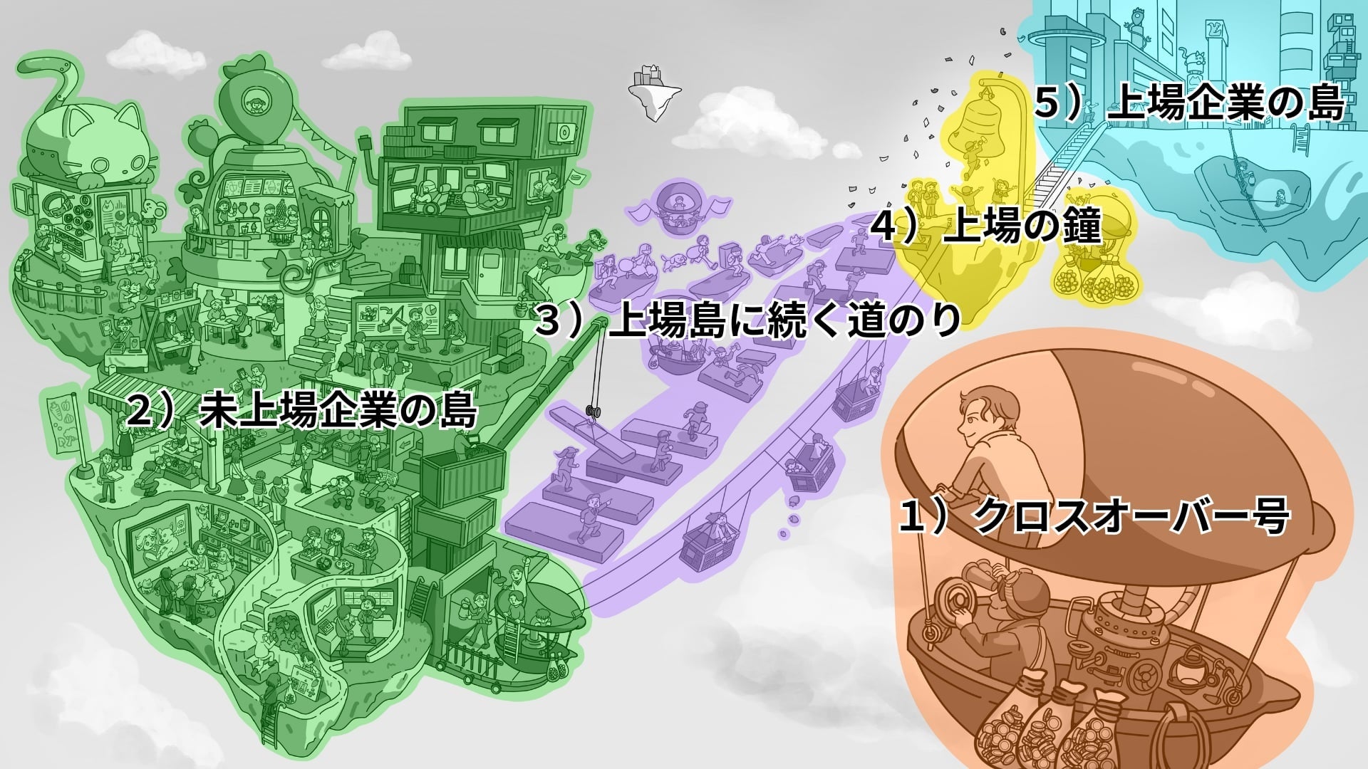 すでに上場した企業が連なる島です。上場企業群のビルのなかには、上場後もさらなる成長を遂げた3社の大きな自社ビルも描かれています。