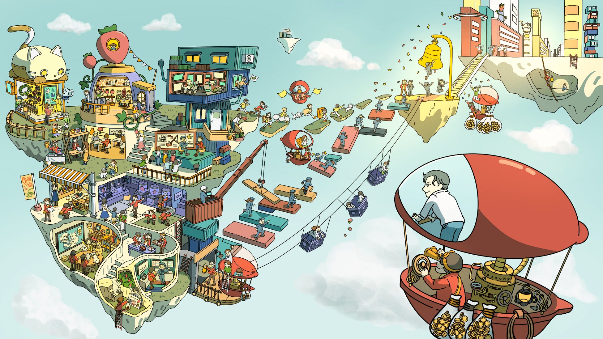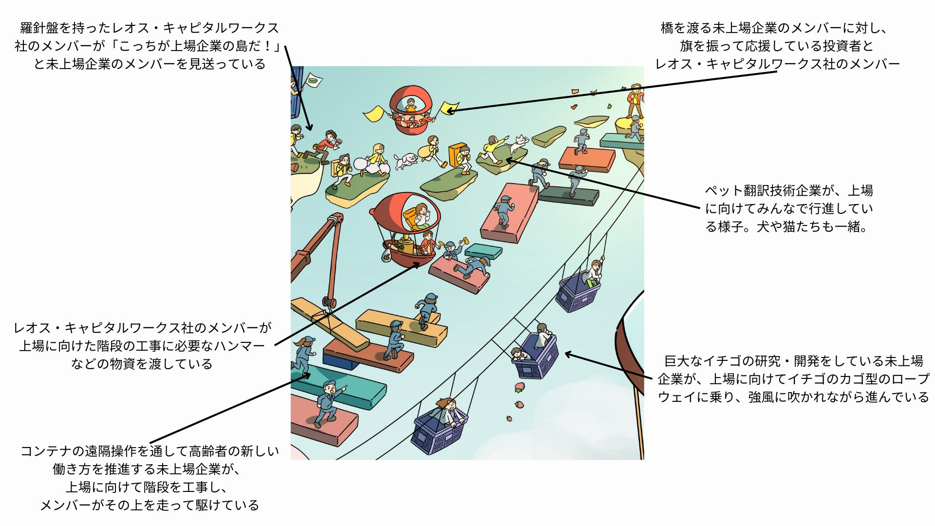 重たい荷物を背負いながらの大移動や、自ら上場への道を建設して駆け上がったり、イチゴの籠を模したロープウェイが強風に煽られながら進んだりと、上場を目指す方法やスピードは3社ごとにさまざまです。1社ごとに違うドラマがある「上場への道のり」のすぐ近くでは、投資者を乗せた赤い飛行船が見守っています。