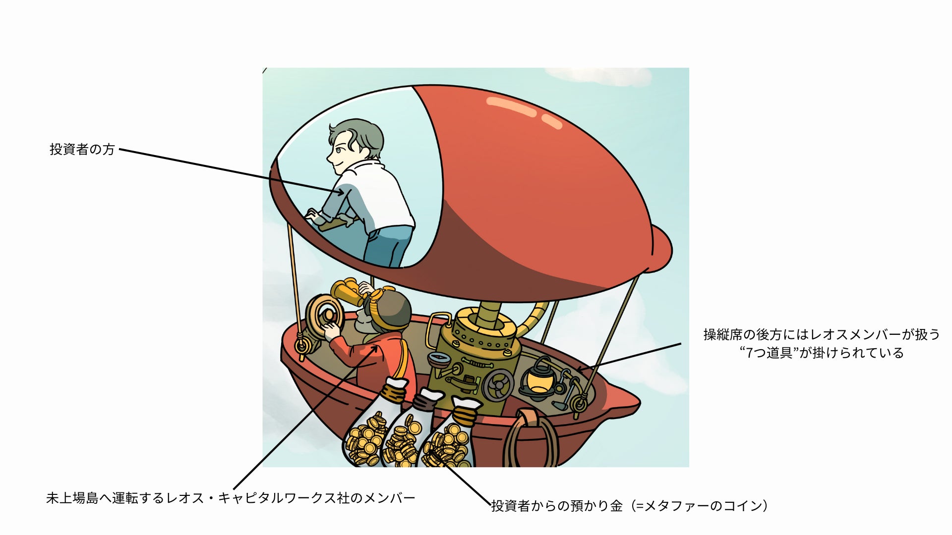 絵の主人公である「投資者」がレオス・キャピタルワークスのメンバーが操縦する赤い飛行船(=「ひふみクロスオーバーpro」の比喩)に乗り、これまで足を踏み入れることができなかった未上場企業の島にワクワクしながら近づいている様子が描かれています。