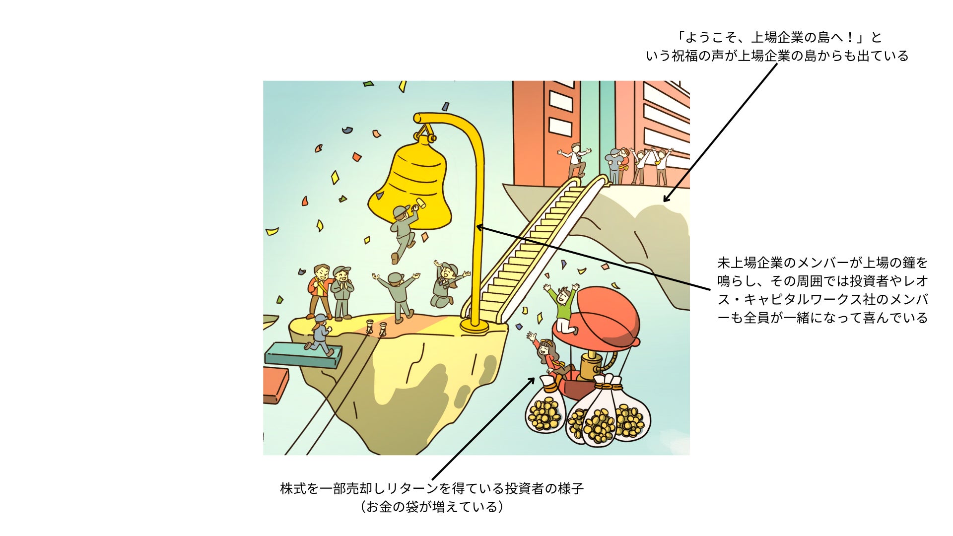 上場の鐘が設けられた島に辿り着いた未上場企業が鐘を鳴らし、上場の瞬間を喜んでいます。