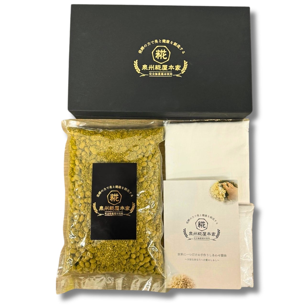 泉州糀屋本家では、製造が難しく温度管理が必要な麹をこだわりをもって製造し、その後の調理工程は作り手の常在菌を使って作成してもらえる手作り醤油キットとして販売しています。