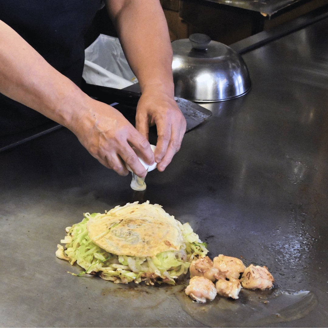 肉汁が多すぎても少なすぎてもバランスが崩れ、キャベツの火の通り具合とホルモンの火の通り方、通常のお好み焼きとは違う塩加減を絶秒に繰り返し試作しました。