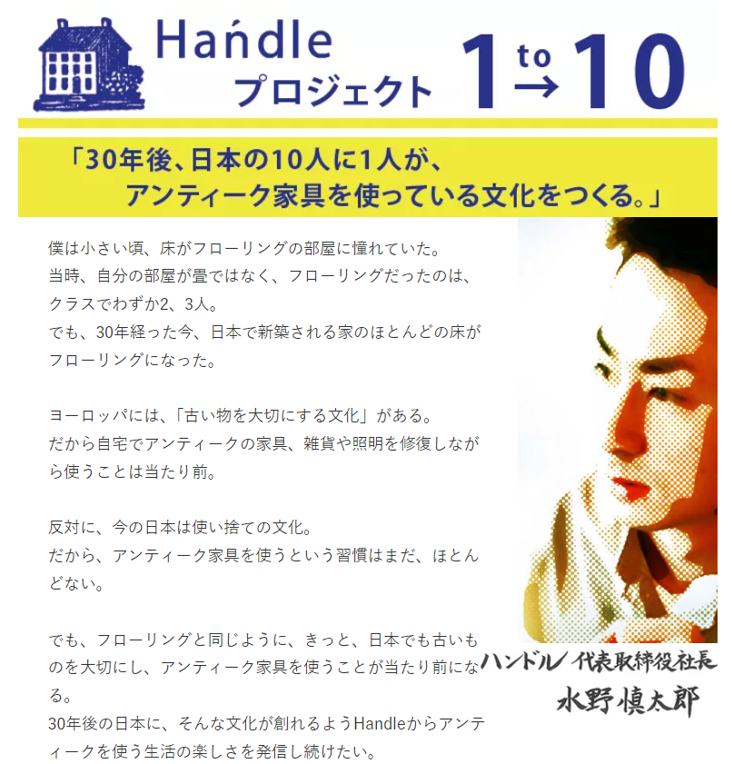 ハンドルのビジョン「1 to 10」プロジェクトでは、「30年後、日本の10人に1人が、アンティーク家具を使っている文化をつくる」という目標を掲げています。