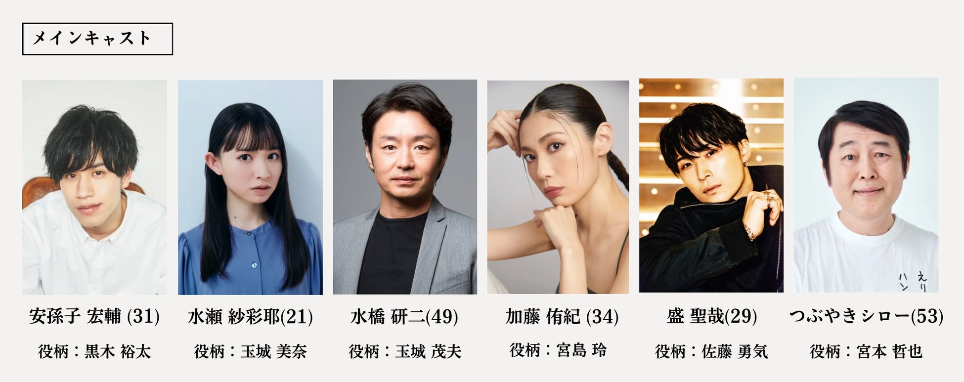 「デリバリー配達員の逆転人生」では、主演を務める安孫子 宏輔(黒木 裕太 役)のほか、総勢18名のキャストが爽快ストーリーを熱演。水橋 研二が演じる大企業の創業者(玉城 茂夫 役)の娘役に、若年層を中心に支持を得る水瀬 紗彩耶がヒロイン(玉城 美奈 役)としてストーリーを盛り上げていきます。さらに、初の縦型ショートドラマ出演となったお笑い芸人のつぶやきシローが大企業創業者の執事役として、ドラマの重要なポストを担います。