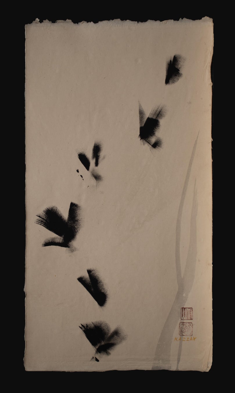 絵画の修復工房を主催する絵画修復家でもある尾形純は、その確かな色の再現力と素材への深い理解を、自身の創造的な制作活動に活かしている。ペインティングでは微妙な和の中間色を再現し、また水墨画では、和紙工場から集めたヴィンテージな古和紙の枯れて黄変した風合いを積極的に活かして独自の技法(墨にアクリルを併用)を採用している。修復家と画家という両側面から新しい世界を切り開く、尾形の挑戦をご覧ください。