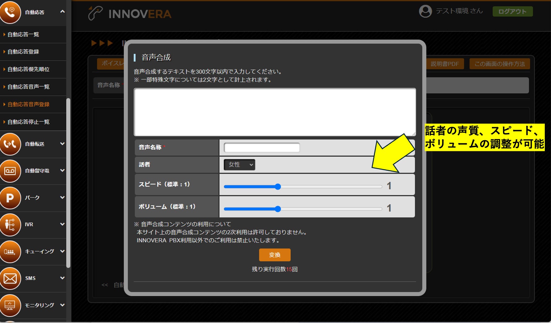 音声合成によるガイダンス作成で、話者の声質を選択できるようになりました。また、話すスピードやボリュームも調節できるようになり、お好みのガイダンスを簡単にINNOVERA上で作れるようになりました。さらにINNOVERA SMSへの着信前に流すガイダンスへの設定も可能になりました。
