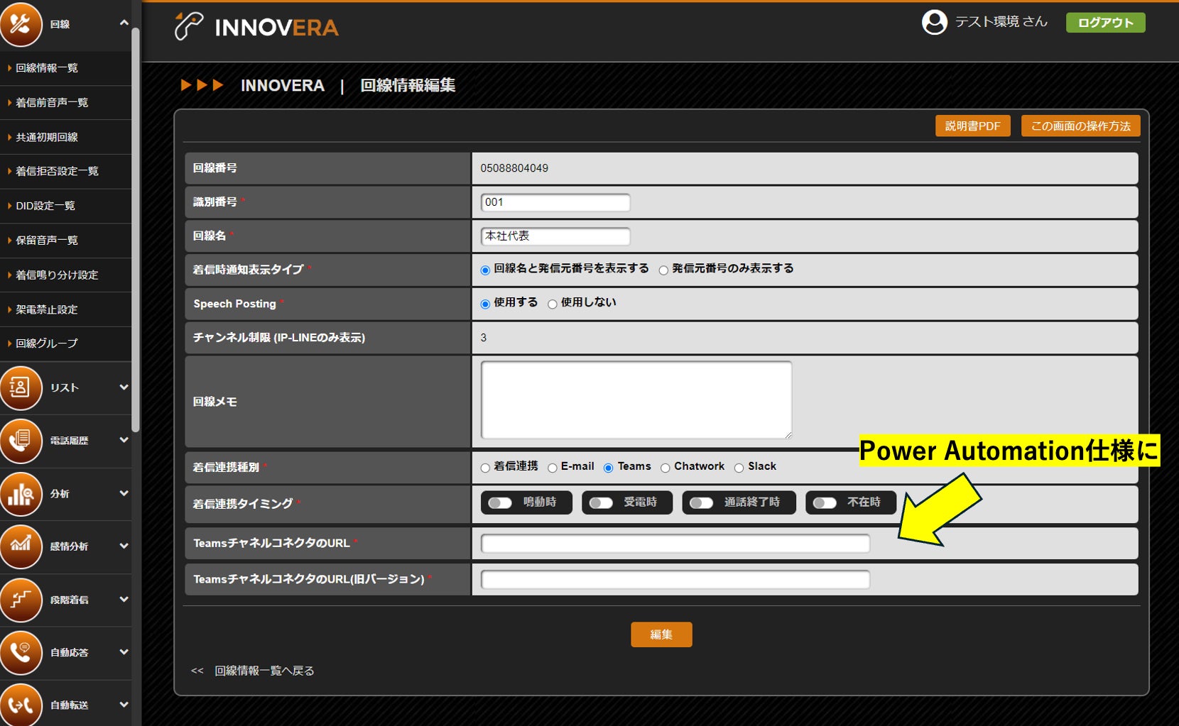 INNOVERAには着信があったことをMicrosoft Teamsへ自動通知する機能が備わっていますが、今回は現在のWebhook方式に変わり、Microsoft Power Automate仕様となったため、設定項目が追加されました。
