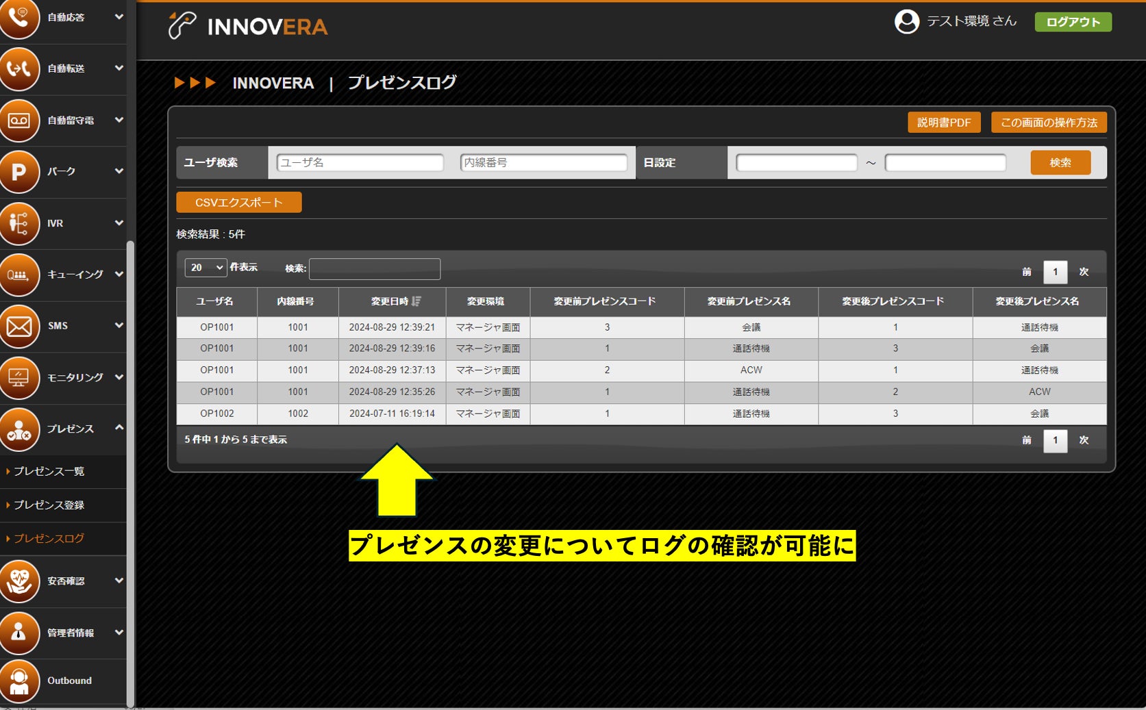 INNOVERAには通話可能や会議中等、ユーザーがそれぞれどのような状態かを表示するプレゼンス機能が備わっていますが、その変更についての履歴が確認できるようになりました。さらにCSVでの出力も可能で、ユーザーの状態管理を支援します。