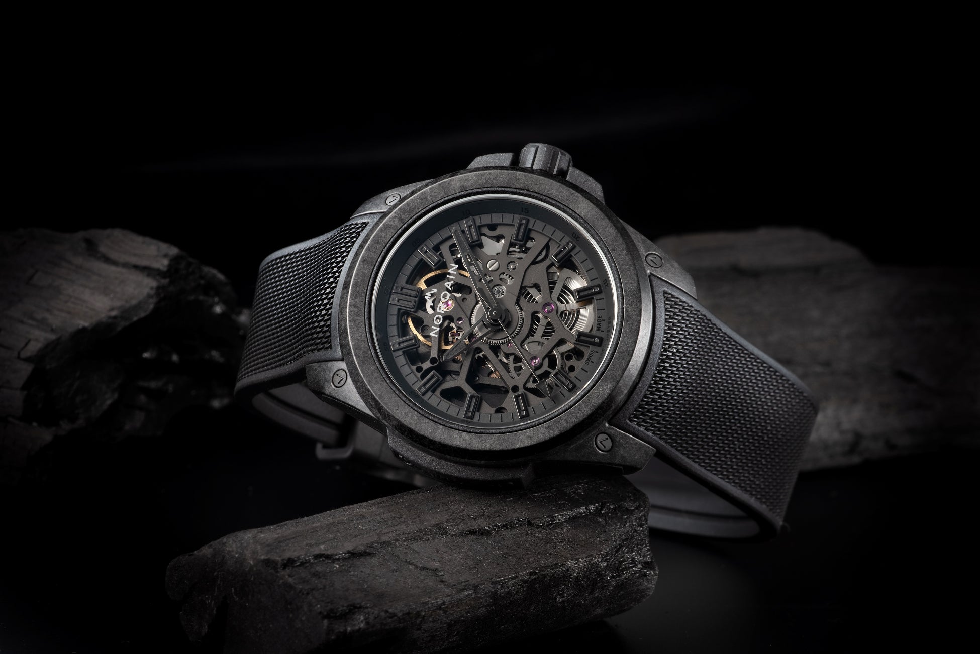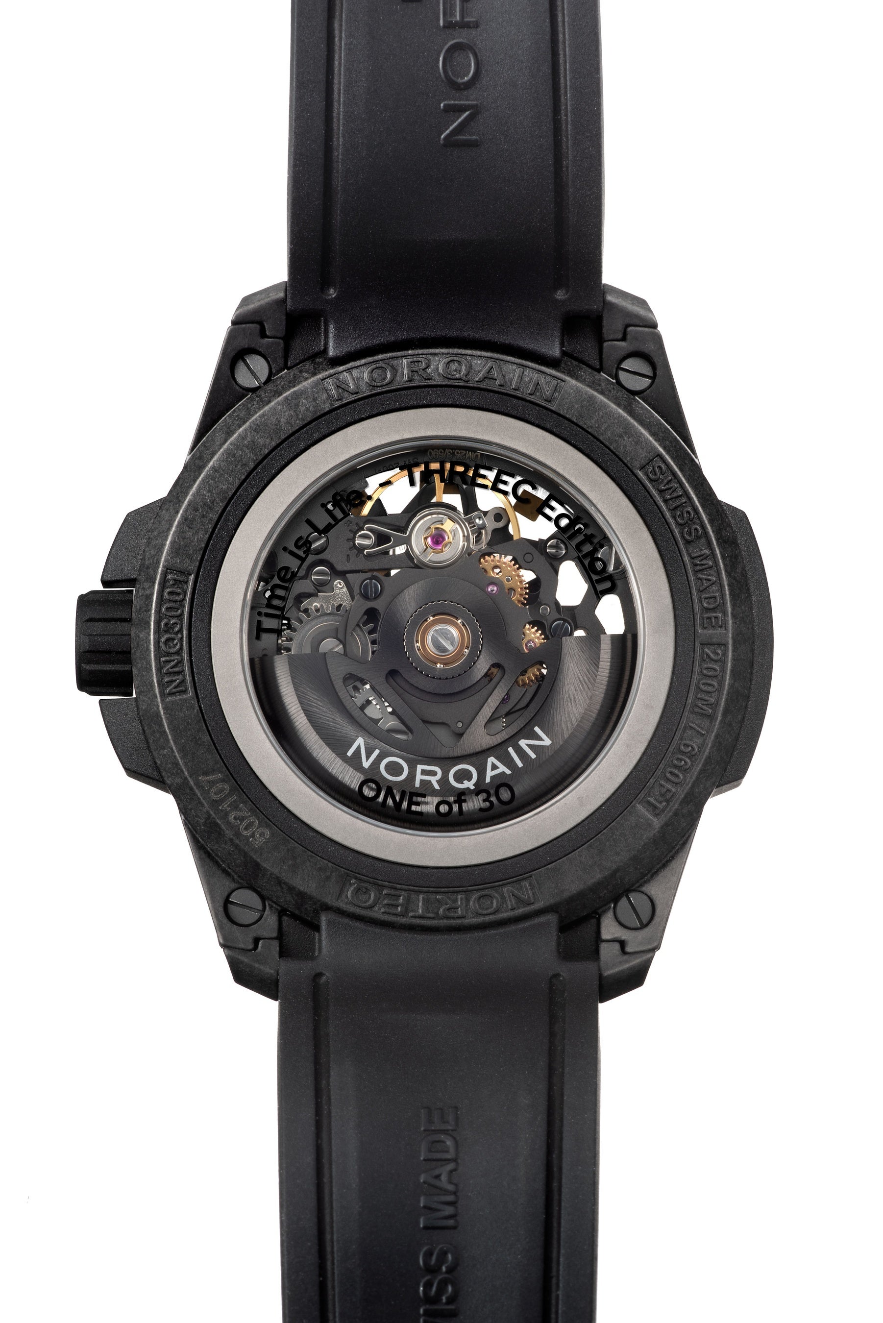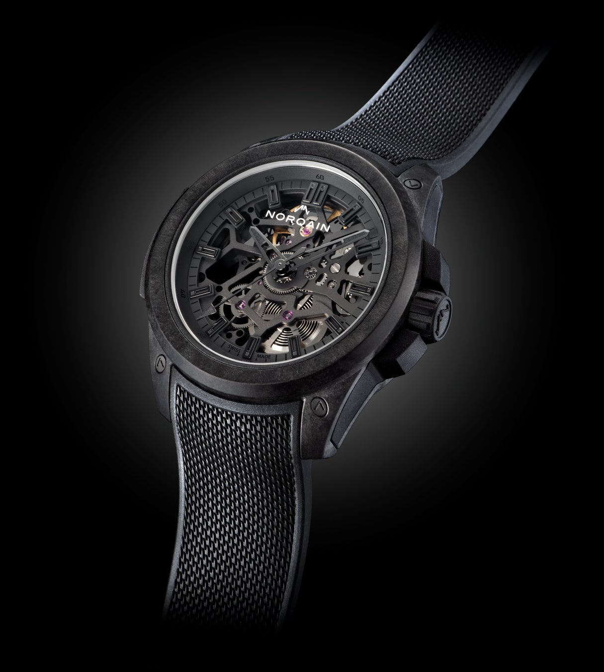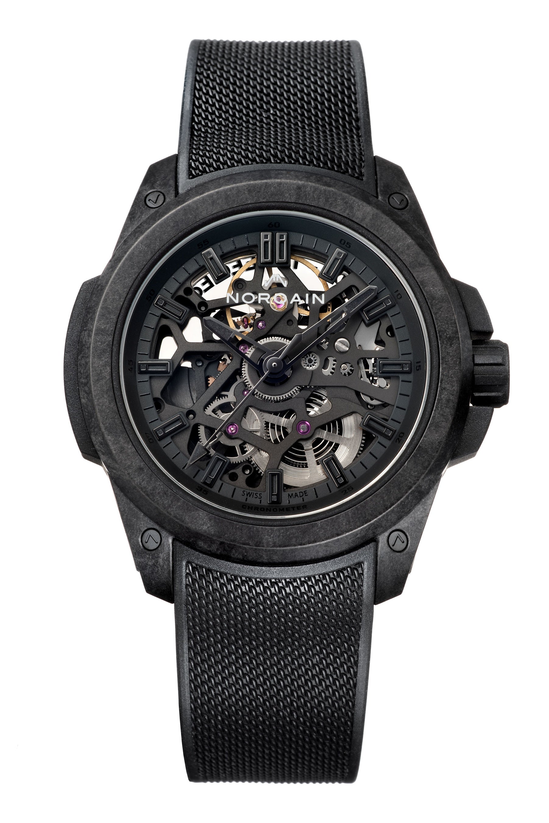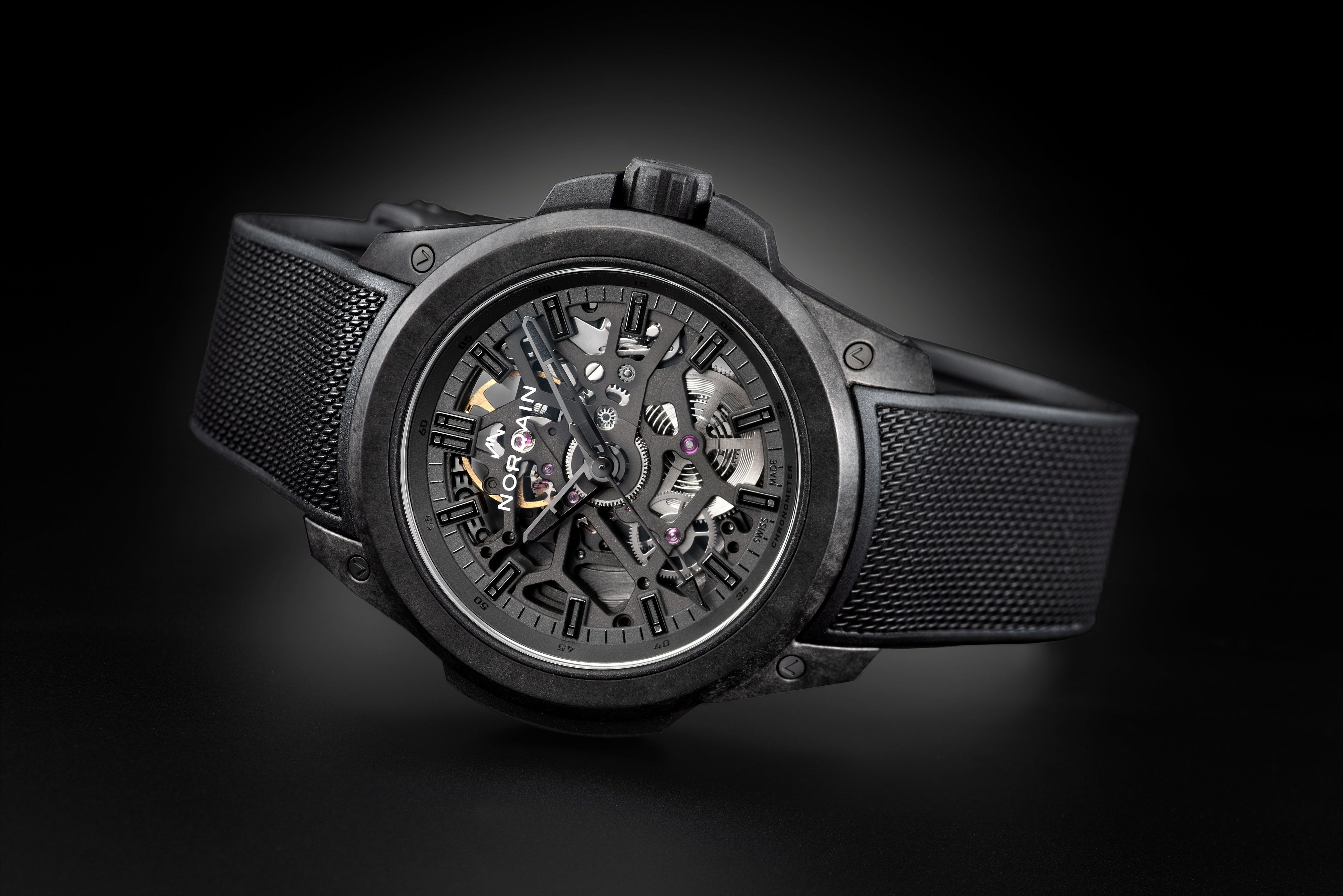 ブラックのノルテック(ノルケインとBIWIが共同開発したカーボン素材)ケース、ブラックスケルトンダイヤル、ブラックラバーアブソーバーのそれぞれの光沢の違いが落ち着きと立体的な深みをもたらしています。