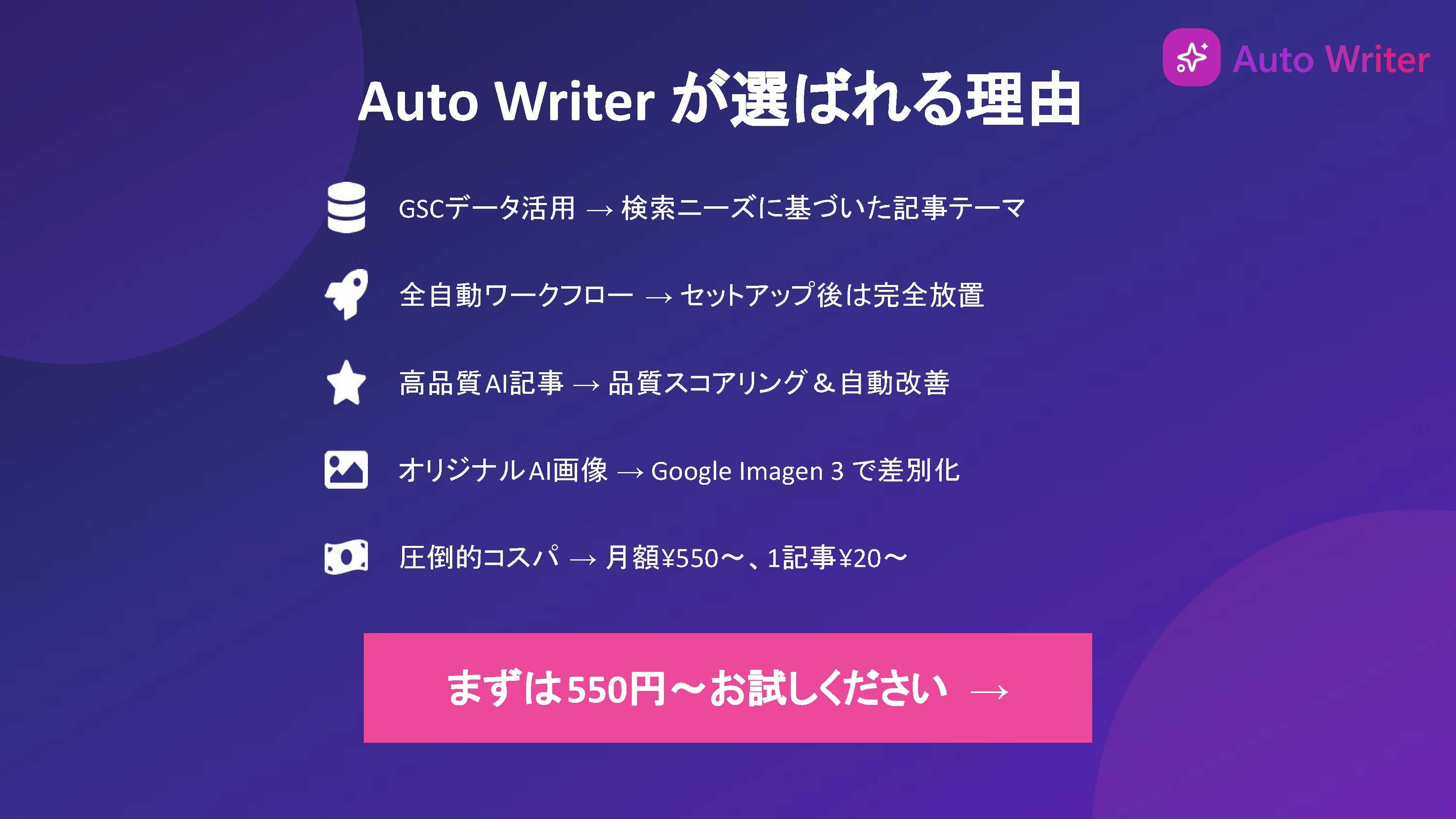SEO特化型AIライター「Auto Writer(オートライター)」を正式リリース〜 Google Gemini × Search Console連携で、"勝てるキーワード"の記事を完全放置で量産 〜