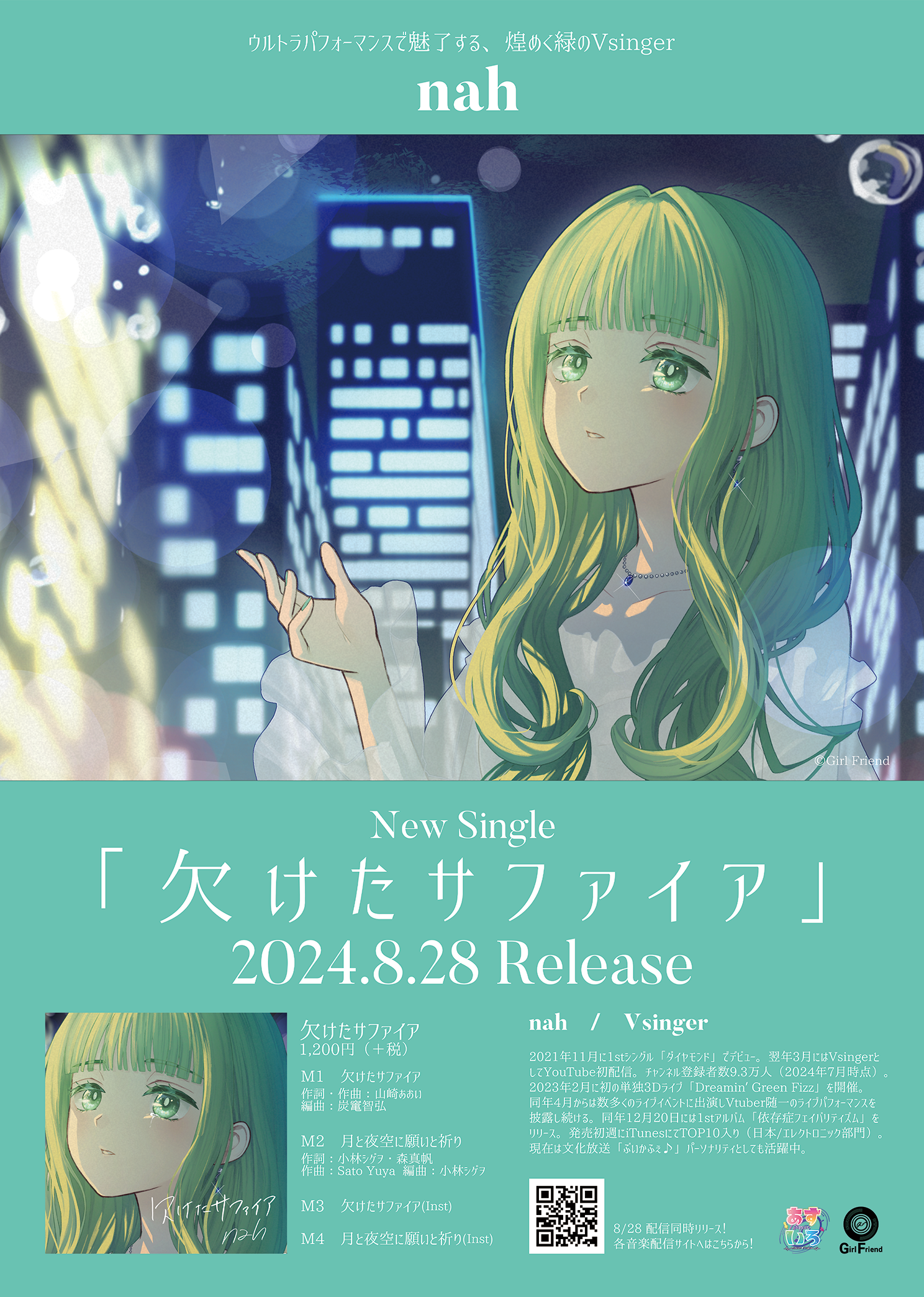 「ウルトラパフォーマンスで魅了する、煌めく緑のVsinger」nahが、新曲『欠けたサファイア』を8/28(水)にリリースする。