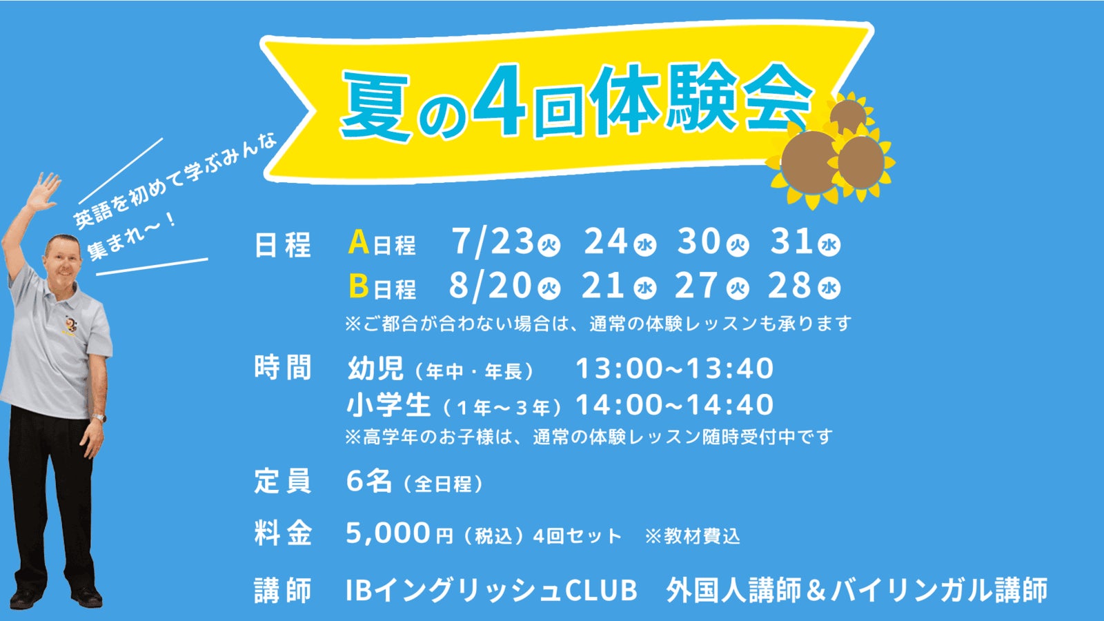 【IBイングリッシュCLUB】幼児~小学生向けの夏の英会話体験会!満員になり次第、募集終了!この夏、英語を楽しく好きになろう!