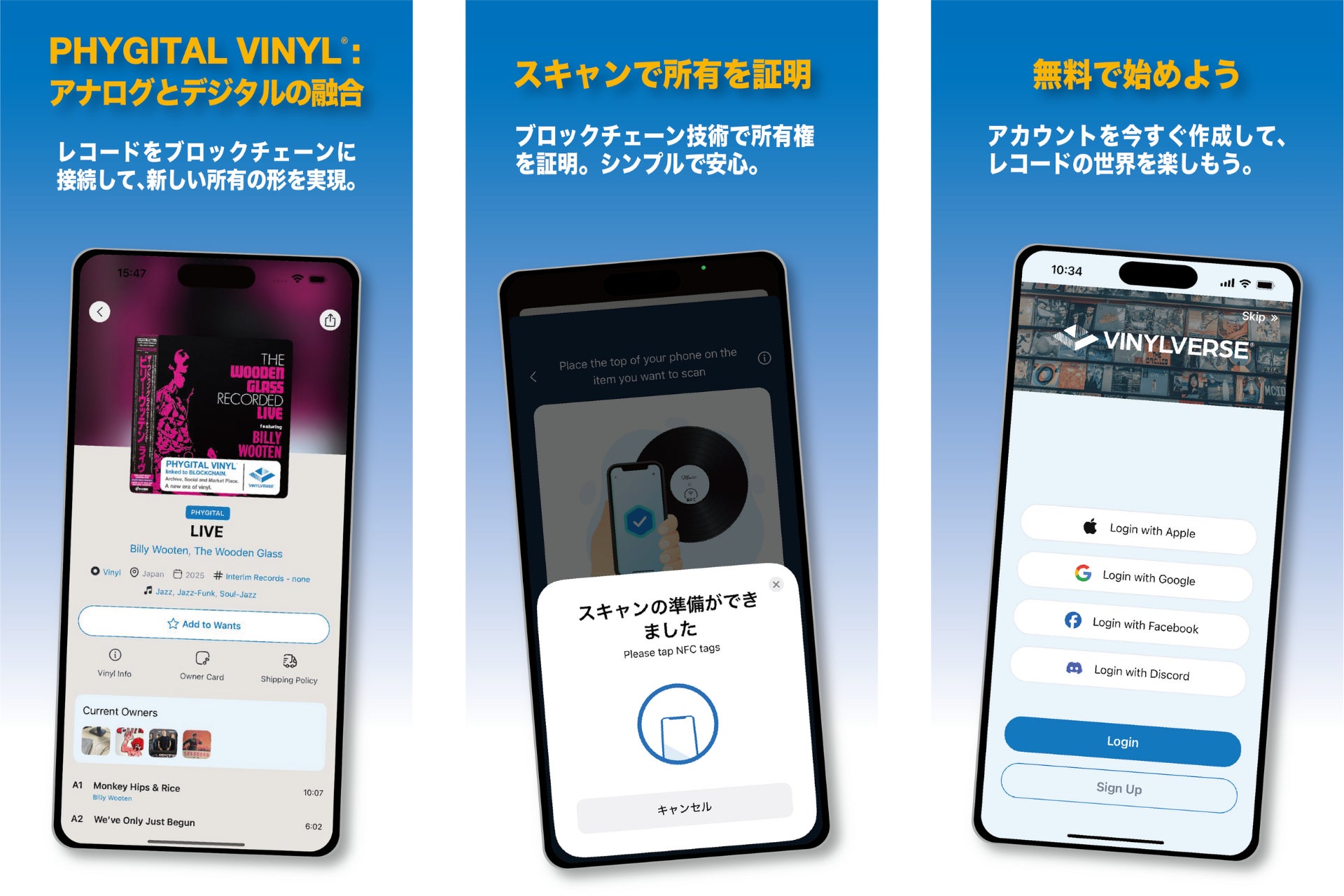 VINYLVERSEをダウンロードして会員登録するだけで、あなたのレコードコレクションを美しく管理し、音楽ファン同士のつながりを広げることができます。