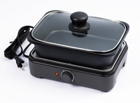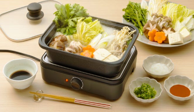2種類の脱着式プレート【焼肉プレート×深鍋】が付属の本製品は、レクタングル型のコンパクトな多機能鍋で、1人用としての使用や、おかずや晩酌のおつまみ用としてシェアするなど、ライフスタイルに合わせた使い方で“熱々出来たての料理”が味わえる卓上調理家電です。