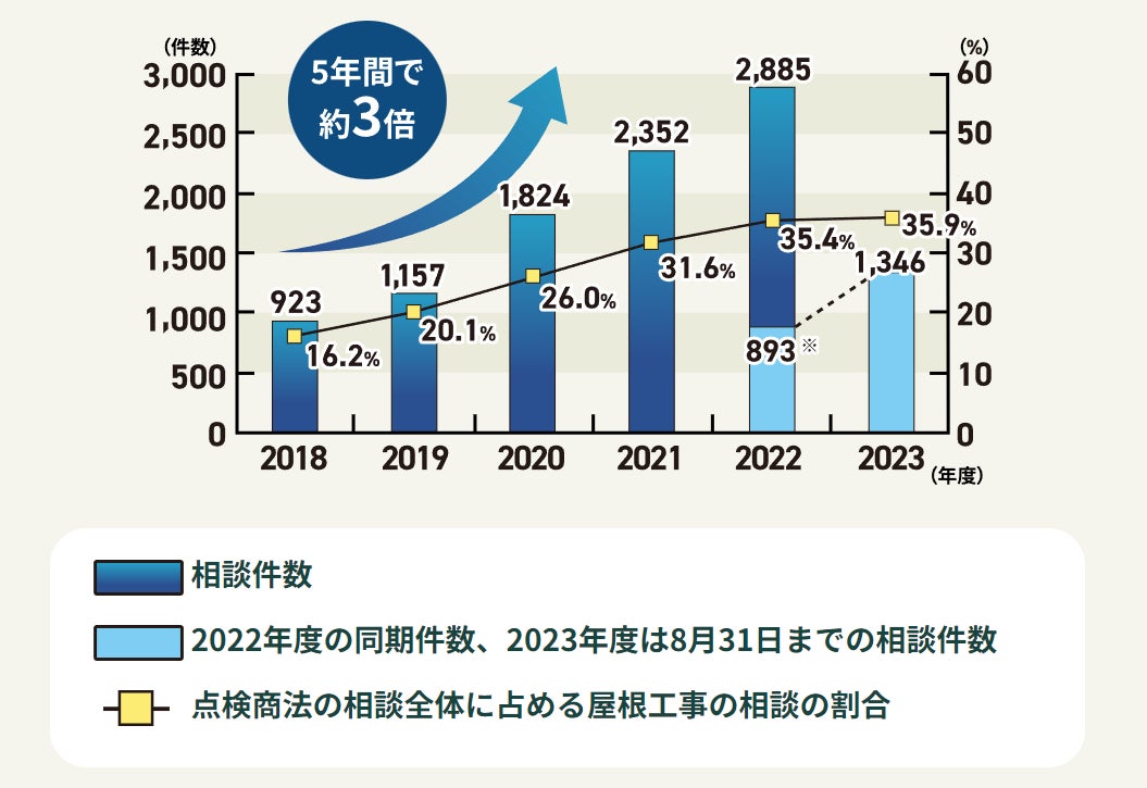 独立行政法人「国民生活センター」の2023年10月11日公表によると、全国の消費生活センター等に寄せられる「屋根工事の点検商法」に関する相談が増加しています。