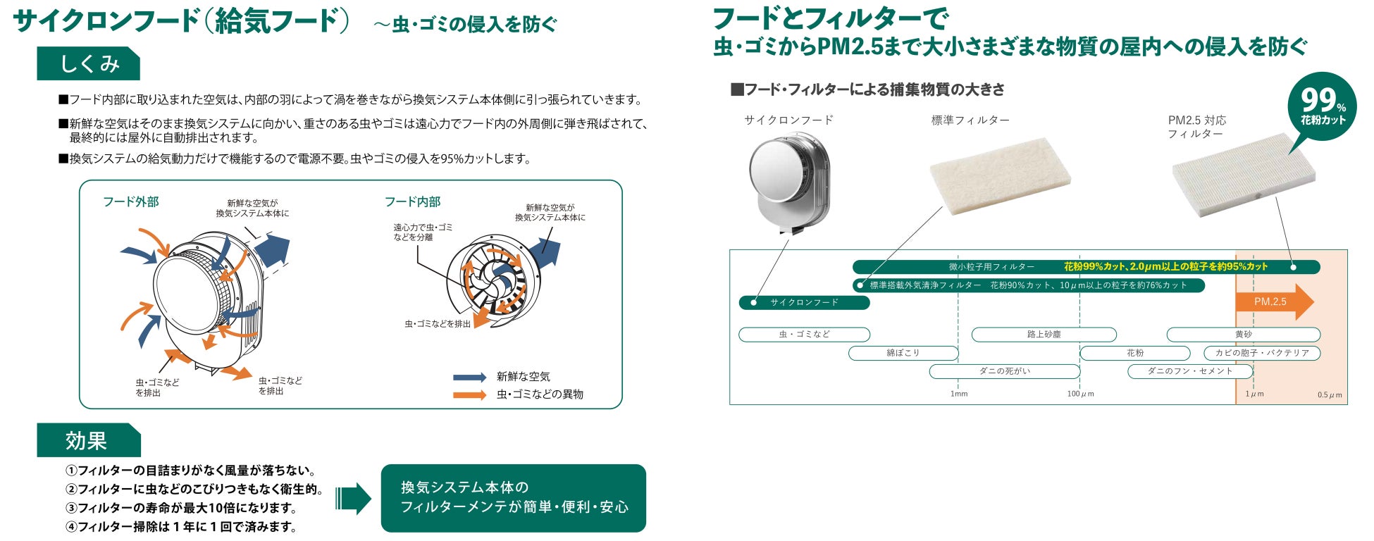 ・サイクロンフードと高性能フィルターの二重の防御で大きなものは虫やホコリから、小さなものでは花粉・PM2.5レベルの微細なものまで幅広くや換気システムユニットや屋内への侵入を防いでいます。