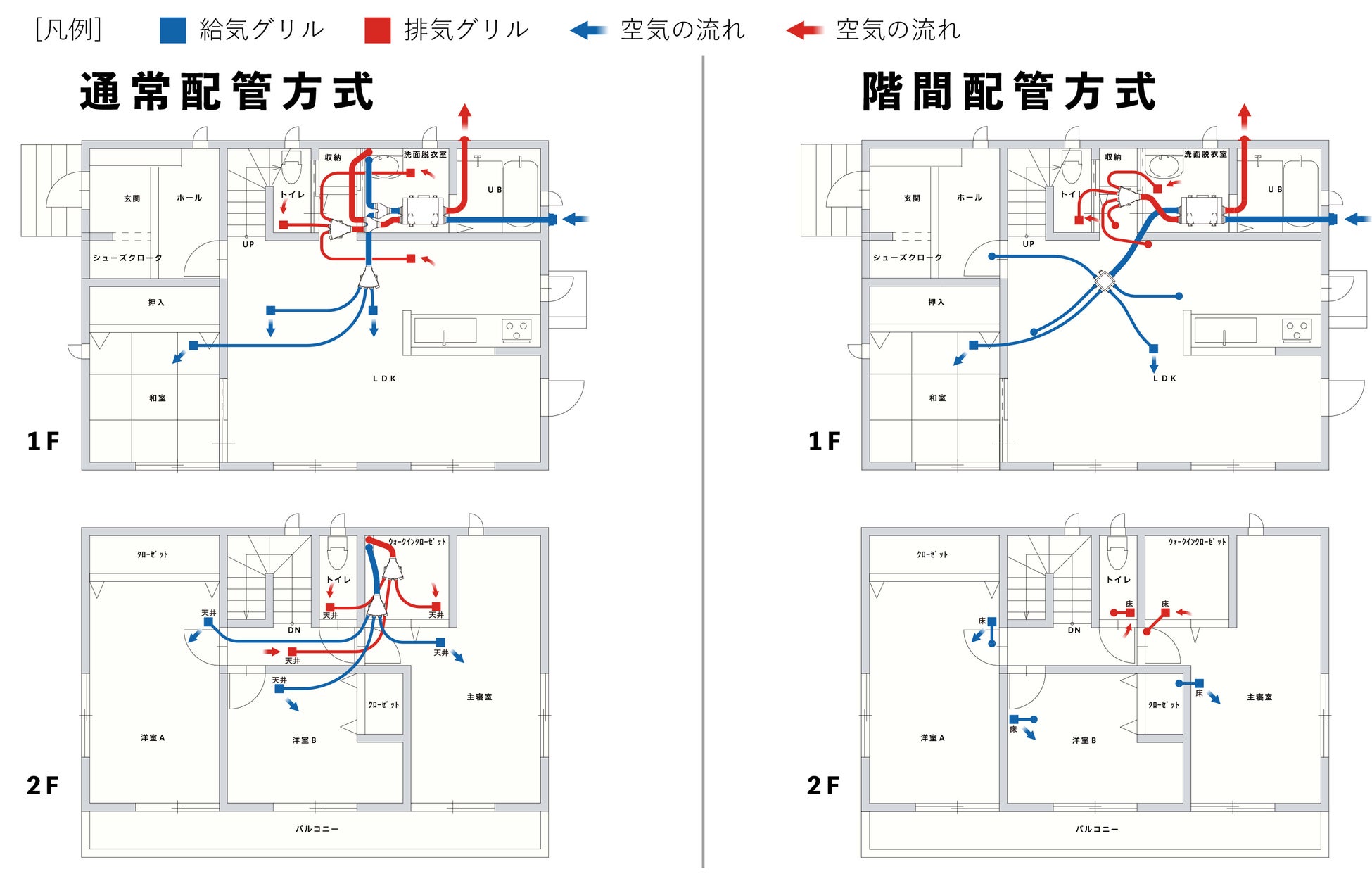 ・専用の床給気口兼排気口を用いることで1階と2階の階間だけで配管・部材設置が可能となり、ダクトなどの材料費削減や施工手間削減から大幅なコストダウンが可能となりました。設計・施工の自由性とコストダウンの両立を実現しました。