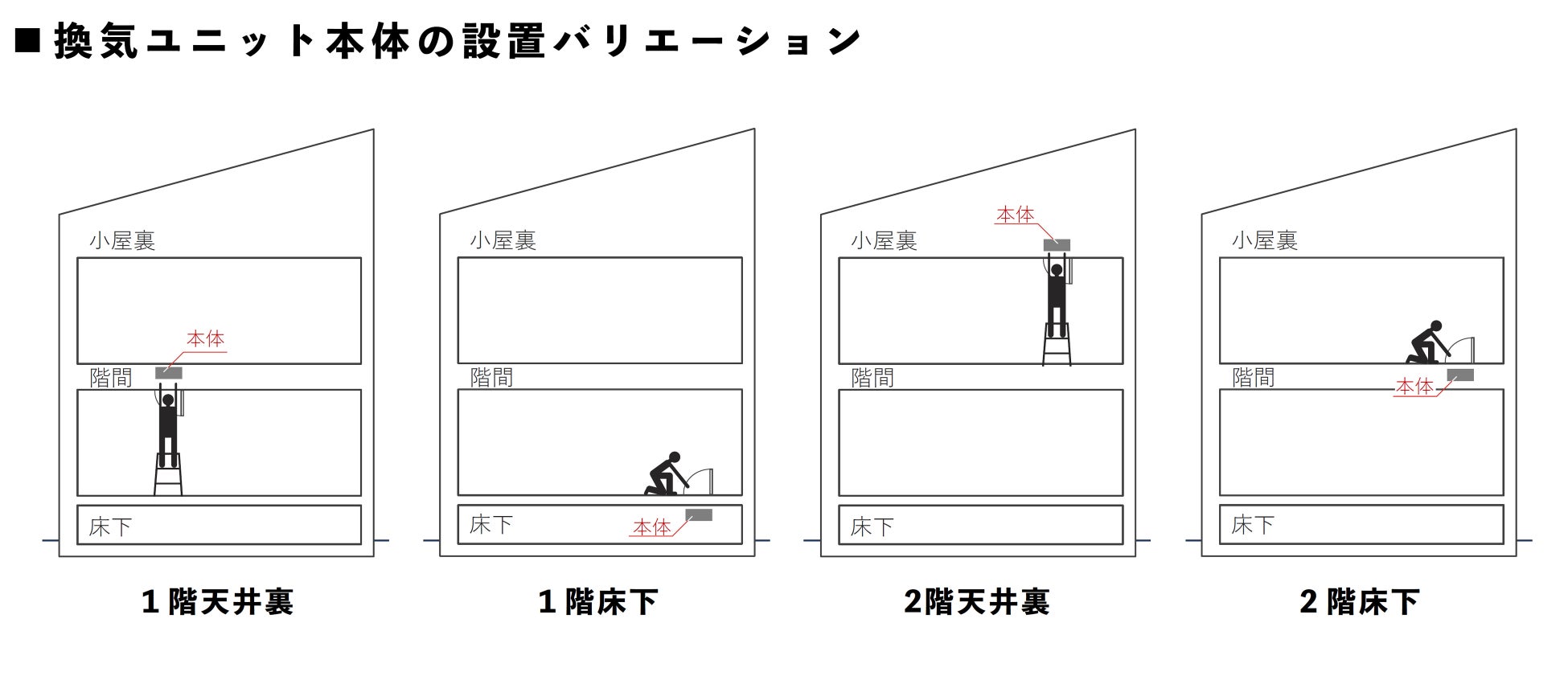 ・反転設置ができることで換気ユニット本体の設置バリエーションが1階床、1階天井、2階床、2階天井の4通りと豊富となります。