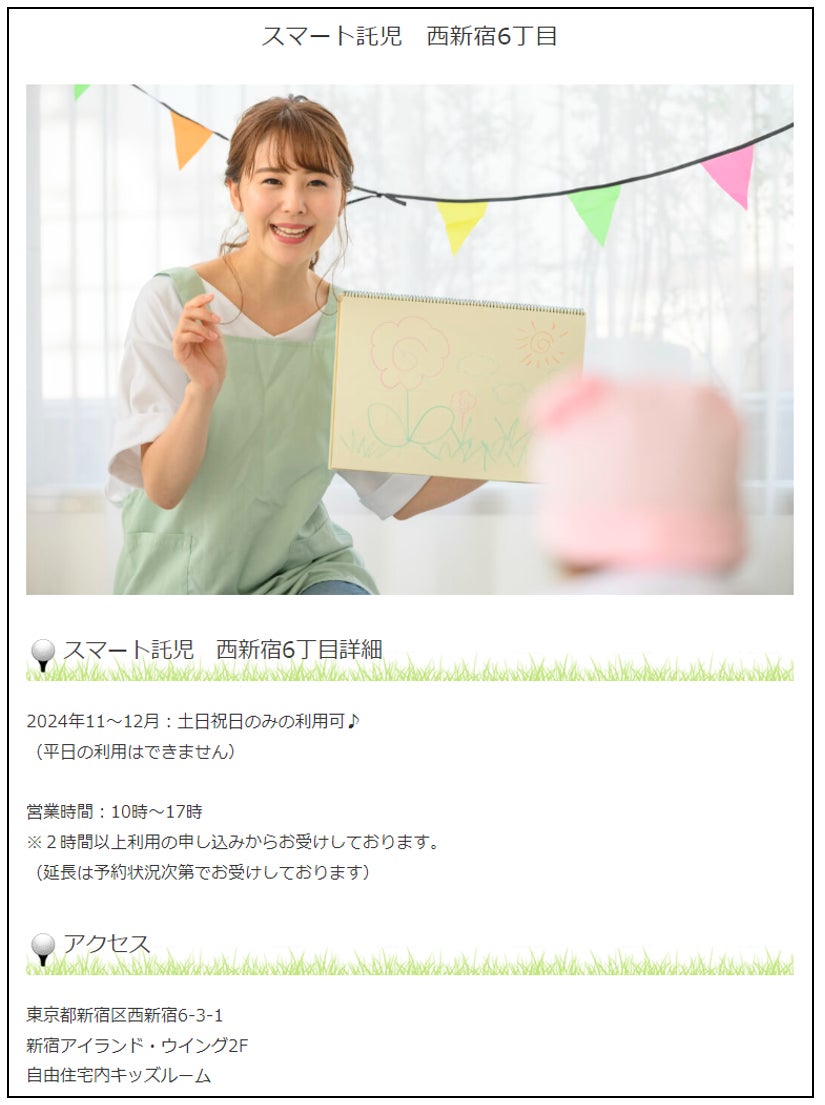 【スマート託児 西新宿6丁目】 https://mamagolf.jp/service/3496/