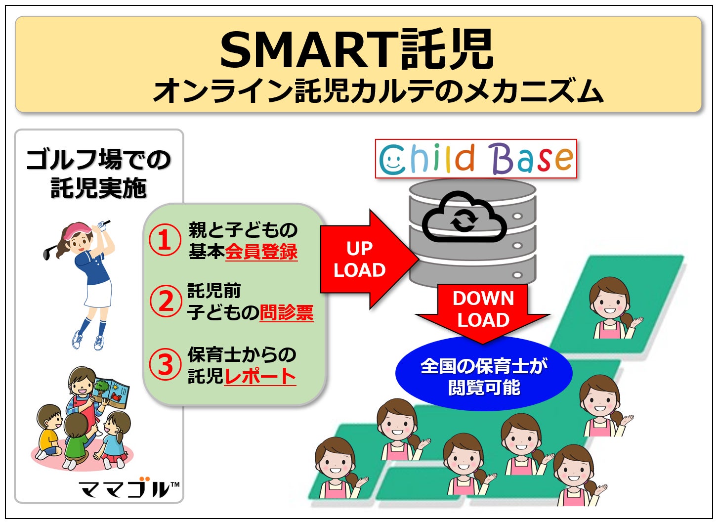 託児に必要なデータをクラウド上に置くことで、全国のゴルフ場のみならず、他のレクレーションや市街地でも、いつでもどこでも「SMART 託児」を開始!