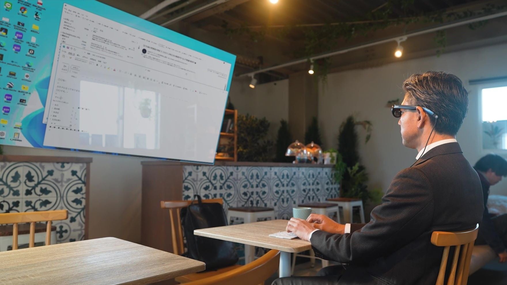 大画面を見ているかのような映像をグラスに投影し、小型のパソコンやスマホとつないでも快適に作業できます。周囲に画面を見られずに作業することもできるため、カフェなどでの機密情報の閲覧も安心です。